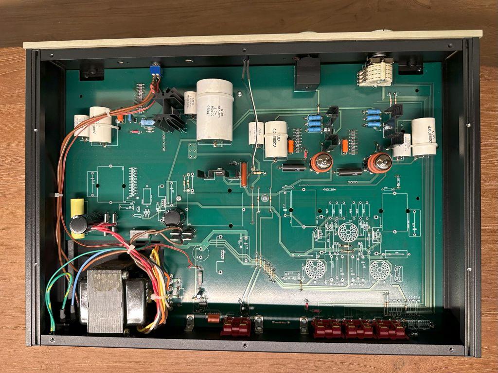 This is the SE model with teflon CJ caps. Uses two M8080 tubes. No phono stage.
