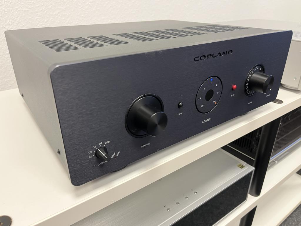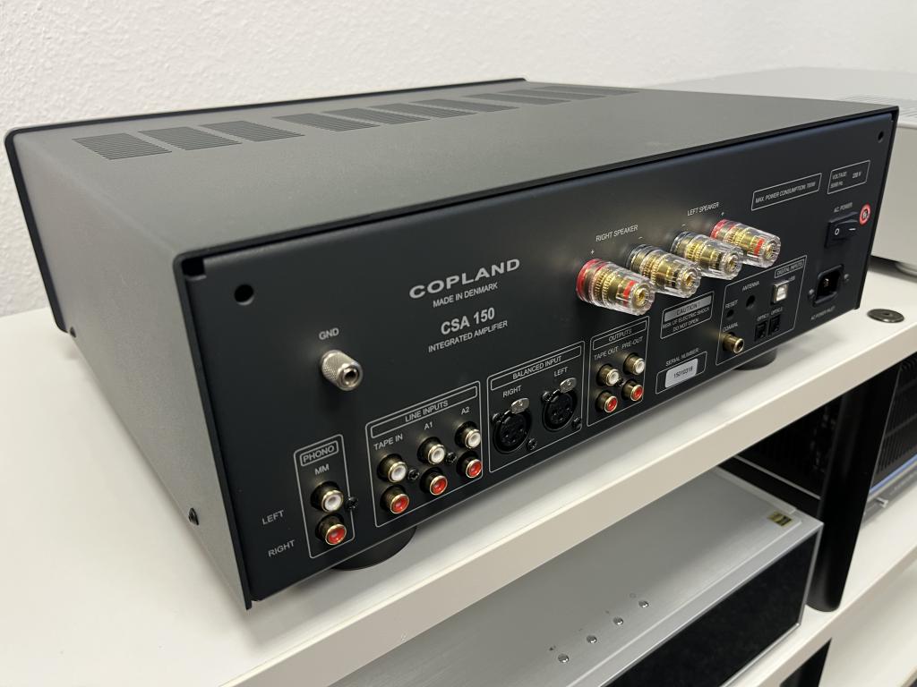 Der CSA150 ist das Spitzenmodell der neuen Copland-Verstärkerserie CSA. Dieses Kraftwerk liefert unter allen Bedingungen genug Leistung, um so gut wie jeden Lautsprecher anzutreiben. Der CSA150 verfügt über vier digitale und fünf analoge Eingänge, inklusive Phono MM. Seine Endstufe liefert 150 Watt Leistung pro Kanal. Die Basisschaltung wurde vom CSA100 übernommen. Um jedoch die Leistung zu erhöhen und die Performance zu maximieren, haben wir das Netzteil mit einem größeren Ringkerntransformator und einer separaten, voll geregelten Stromversorgung für die Treiberstufen der Endstufe aufgerüstet. Darüber hinaus wurde der Wärmeableitungsbereich vergrößert und die Größe des Gehäuses angepasst, um die zusätzliche Hardware unterzubringen.