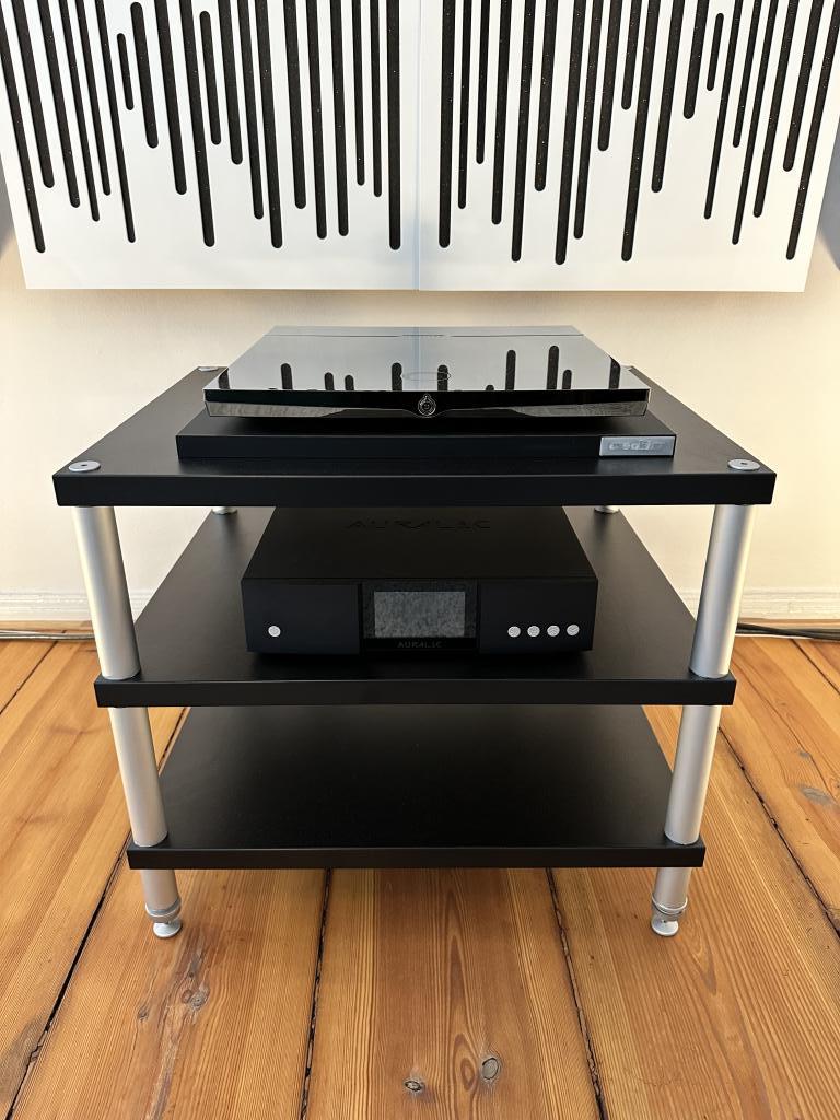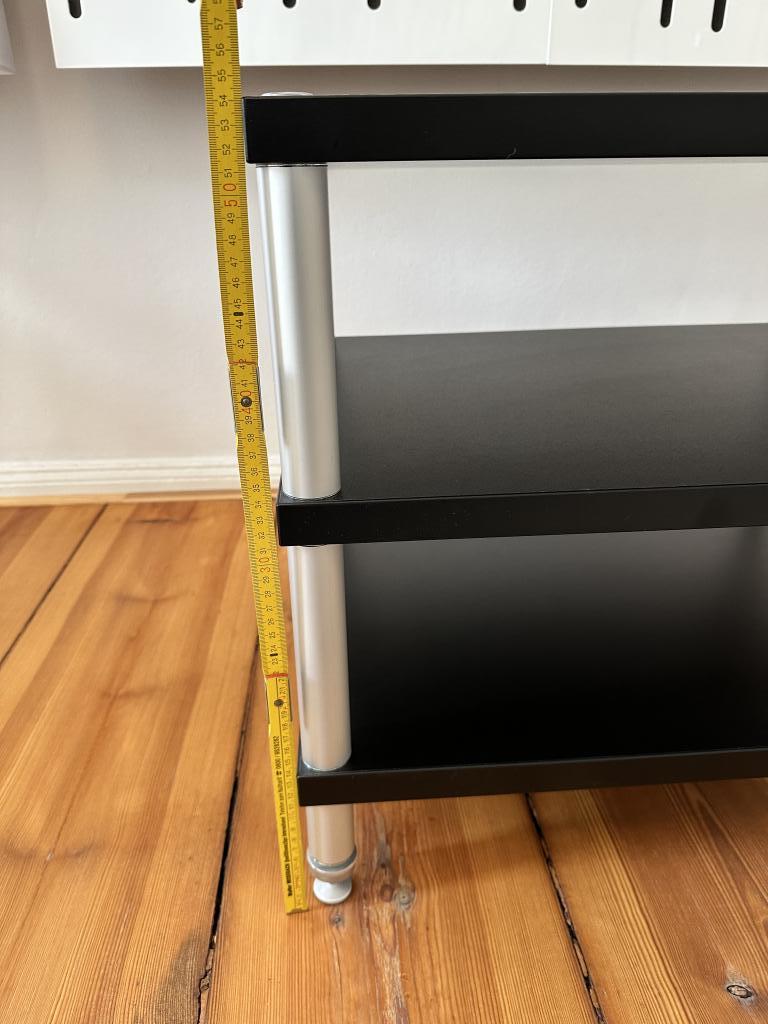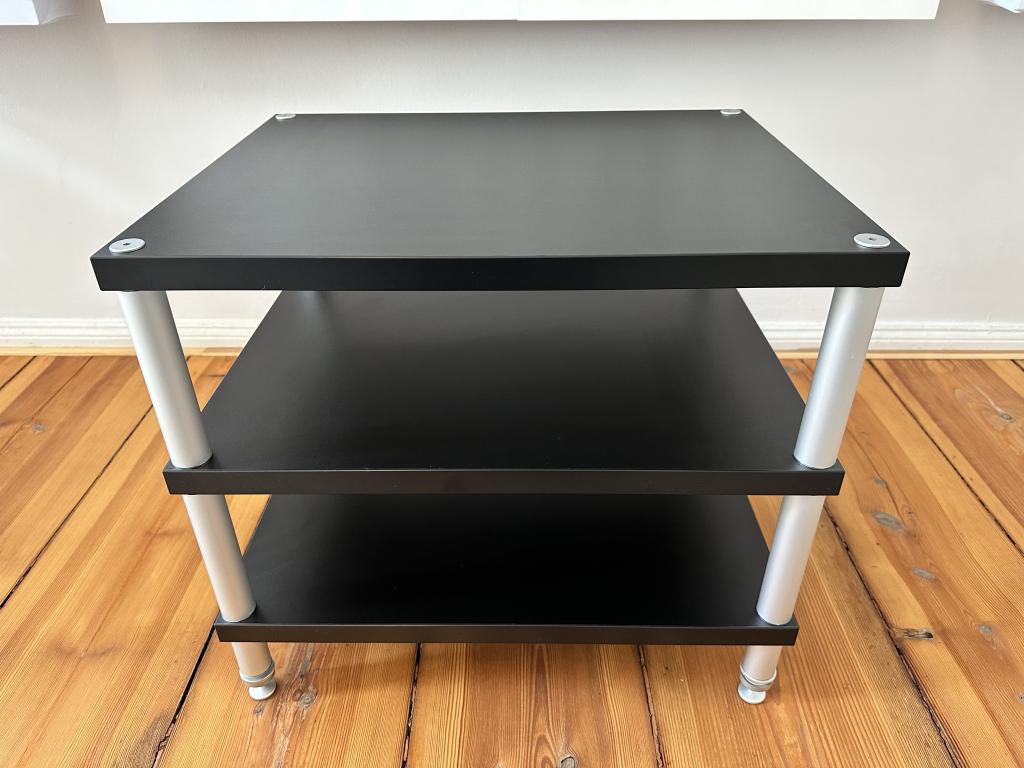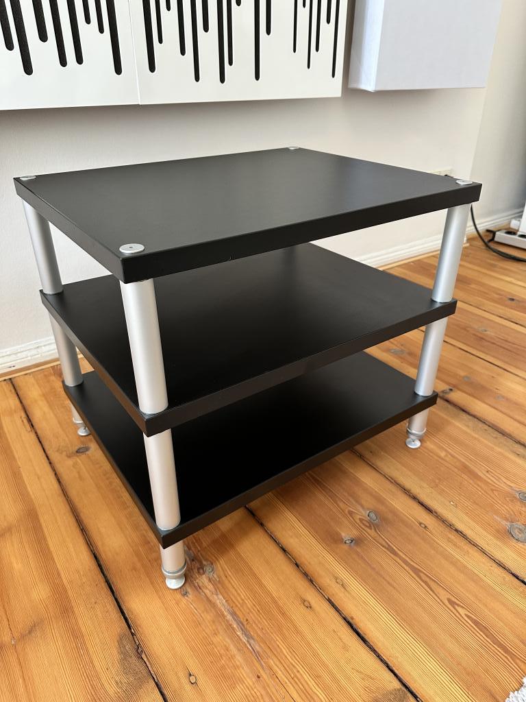 Verkaufe wegen Erweiterung mein Creaktiv Hifi Rack aus der Trend Serie mit 3 schwarzen Böden und silbernen Rohren (gefüllt und gedämpft).