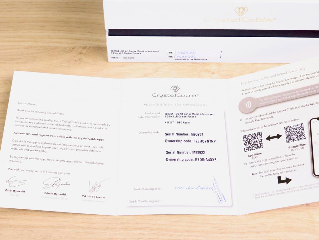 One pair of Crystal Cable Art Series Monet high end silver audio interconnect cables in a fantastic condition. The length is 1,25 metre and they have the original Oyaide Focus XLR connectors. Serial numbers are M95931 and M95932. Retail price is 10.795 euro. The original box and certificate are included. Check our other listings for more interesting items. Free shipping worldwide!