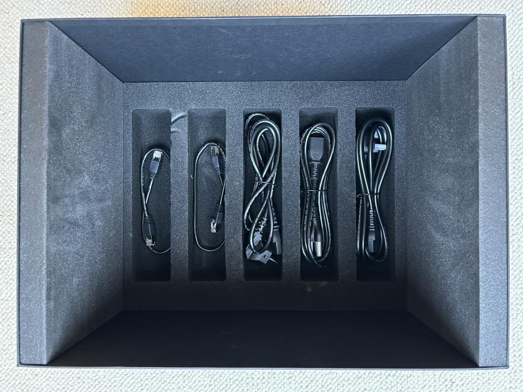 The complete list of parts being offered: the unit, original box with black box inside, power cord with Schuko plug Type F (for Germany), power cord with plug for UK, power cord with plug for US, two Power Link cables and Quick Start Guide with welcome letter in black in black case.