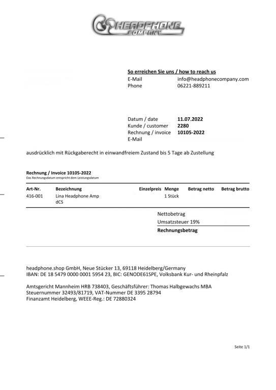 The condition of the component is immaculate and without any functional bugs. The amp was used in my smoke and pet free household. I bought the DCA Lina as new unit Juli 2022 from the authorized DCS retailer headphone.shop in Heidelberg.