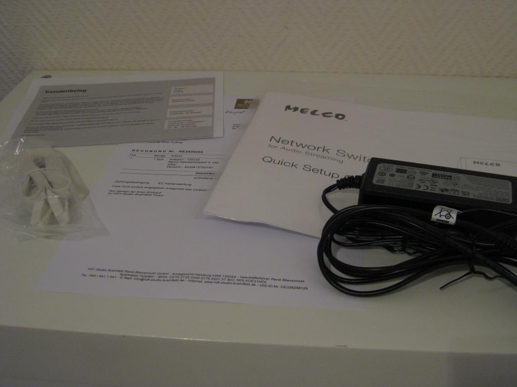 Der Switch ist in einem sehr guten Zustand, ohne Gebrauchsspuren, und funktioniert natürlich einwandfrei. Die Rechnung des Switches vom Hifi-Studio Bramfeld datiert auf den 03.11.2024.