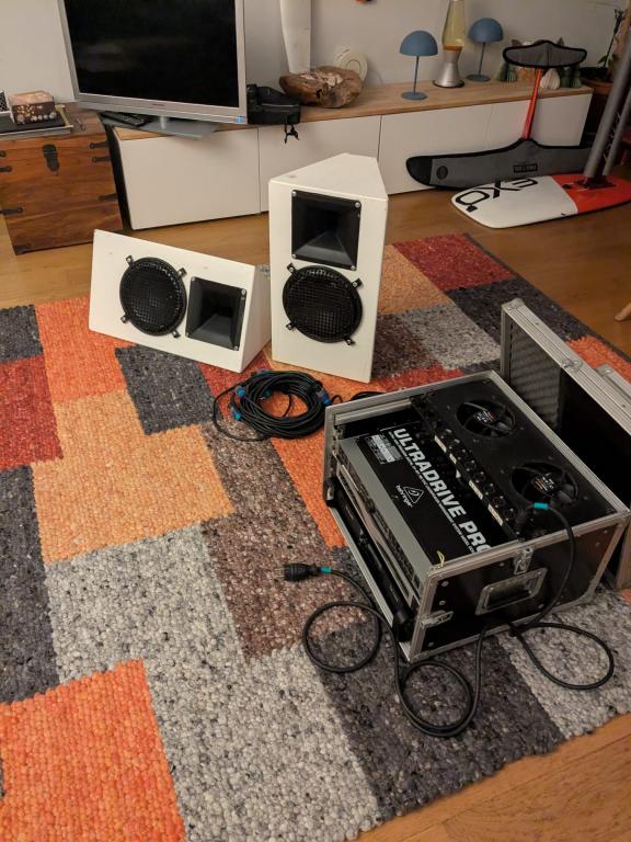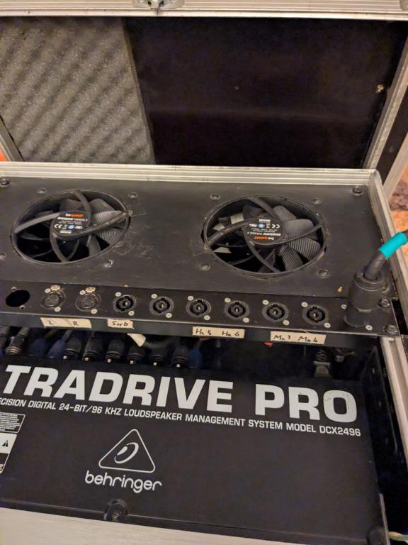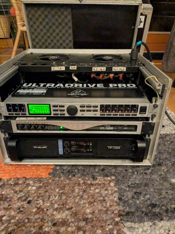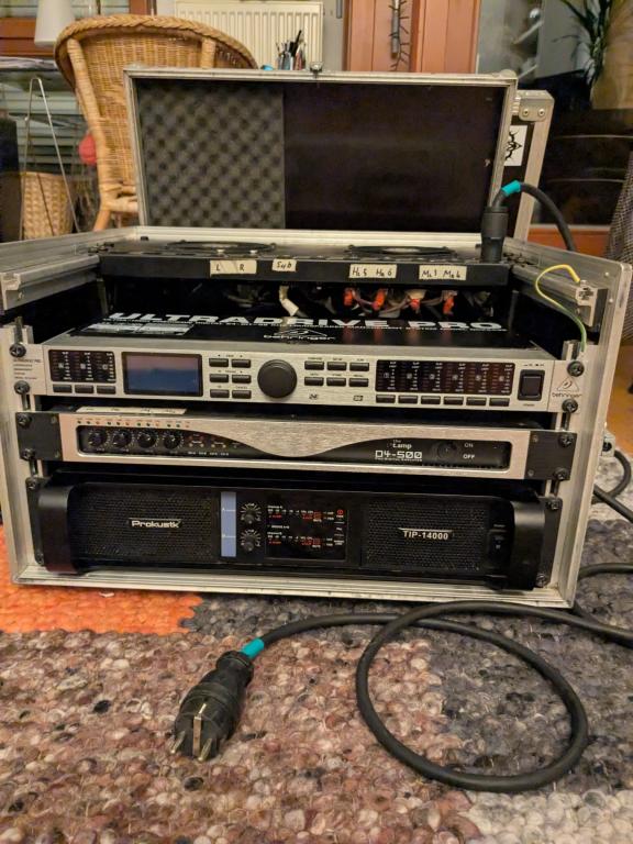 Zum Verkauf steht ein Rack mit Verstärker und Frequenzweiche (DSP) sowie PA-Tops inkl. Kabel