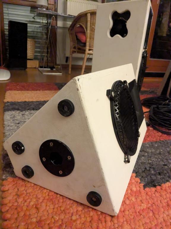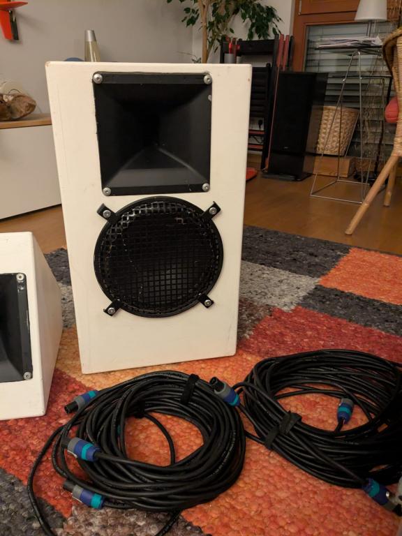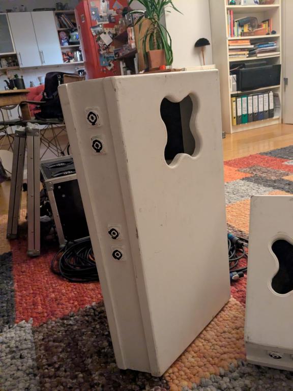 Die Anschlüsse sind intern gebrückt zum Durchschlaufen mit mehreren Lautsprechern. Unten sind Gummifüße gegen verrutschen und ein 35mm Flansch für die Montage auf einem Stativ. Gebaut sind sie aus 18mm Birke Multiplex verleimt und verschraubt.