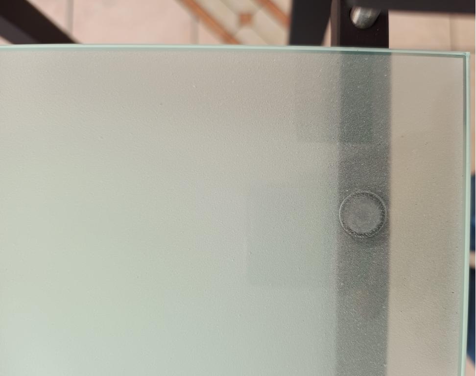 Es besteht aus einem Stahlrahmen mit individuell in der Höhe verstellbaren Auflagen für fünf sandgestrahlte, matte Glasböden.
