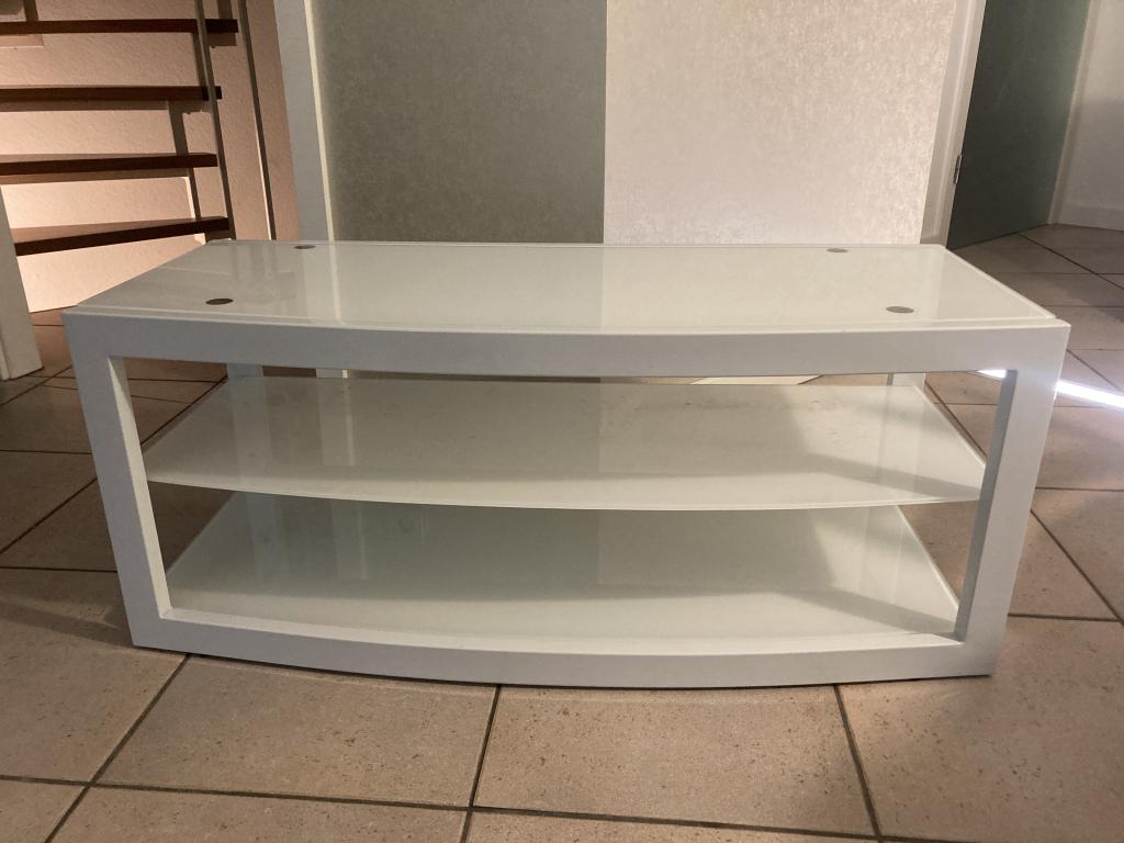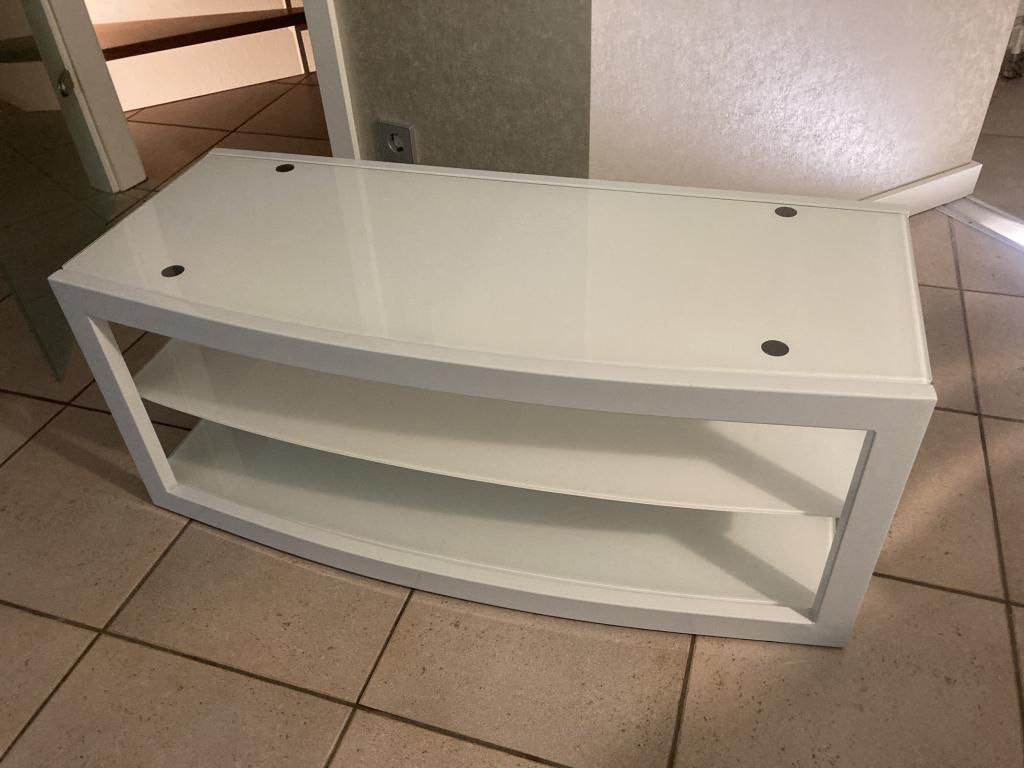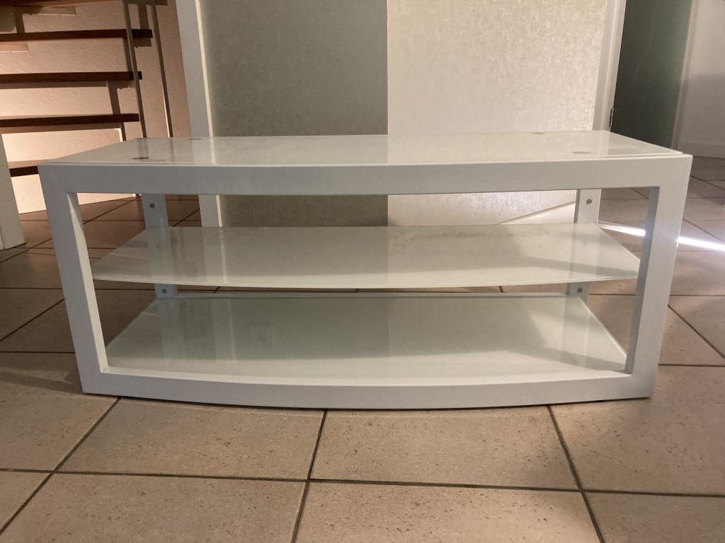 Wir bieten das abgebildete TV Möbel. Der Rahmen ist aus metall, die Böden aus Glass. Der mittlere Boden lässt sich dreistufig in der Höhe verstellen. Guter Zustand. Hat mir viel Freude bereitet da hochwertig und flexibel einsetzbar.