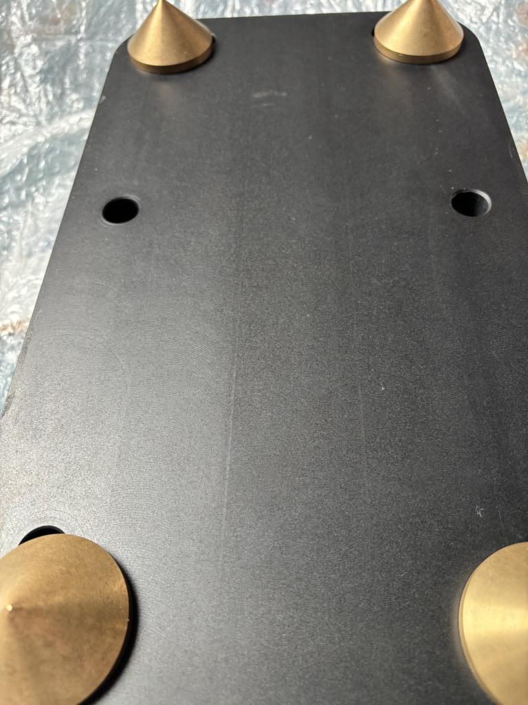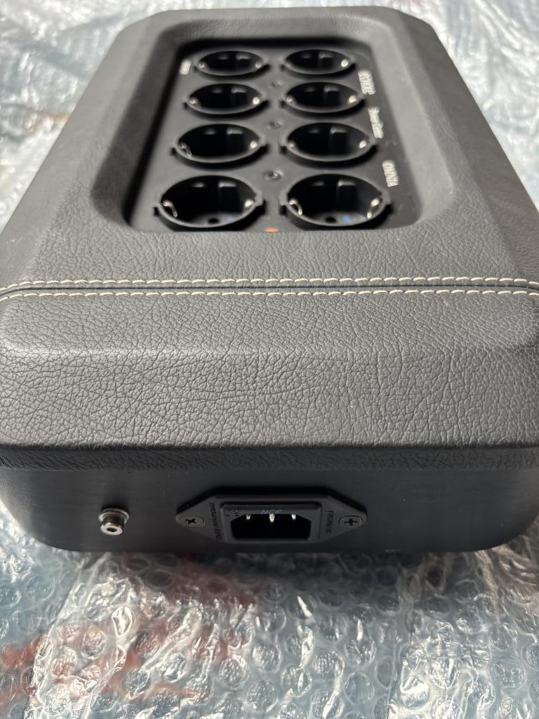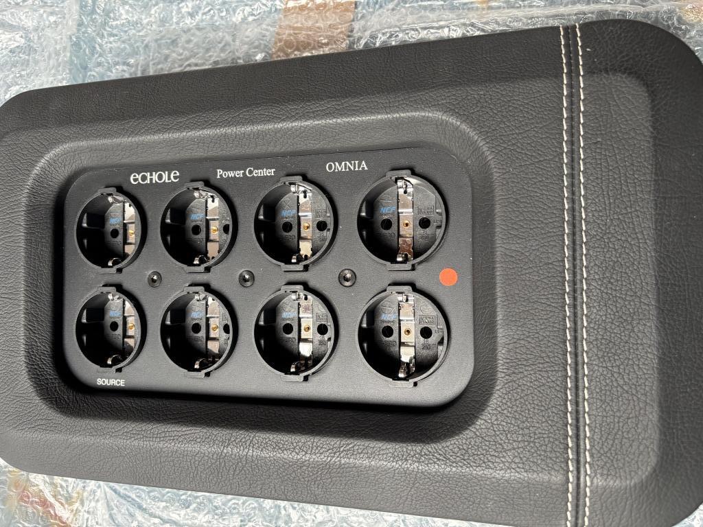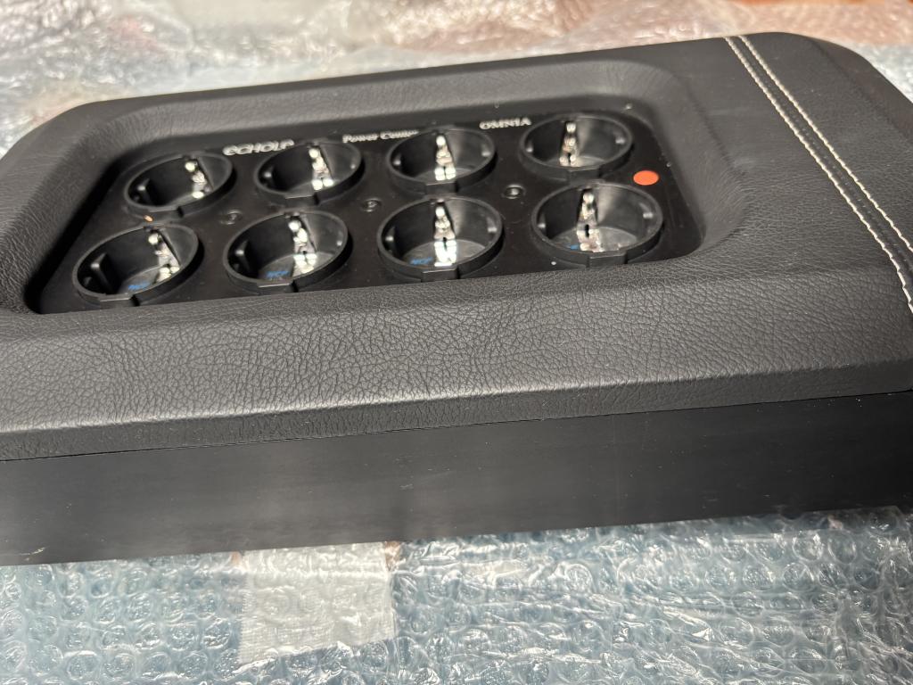 Reference-class ECHOLE power-center on sale; hand-wired with Omnia cabling inside; 6 direct NCF-Schuko sockets plus 2 BYBEE-filtered NCF sockets; massive housing milled from solid aluminum (heavy); black leather & cream-colored stitching; 4 solid brass spikes & cone pickups; originally assembled by ECHOLE; good overall condition from private owner.