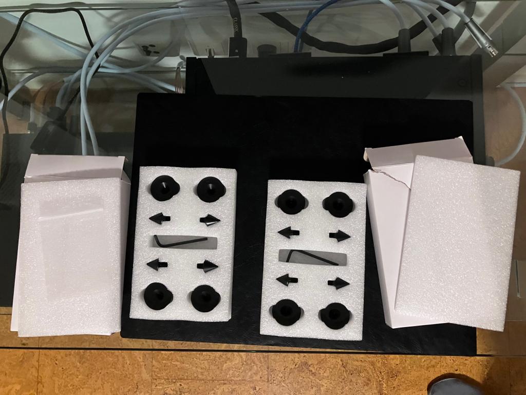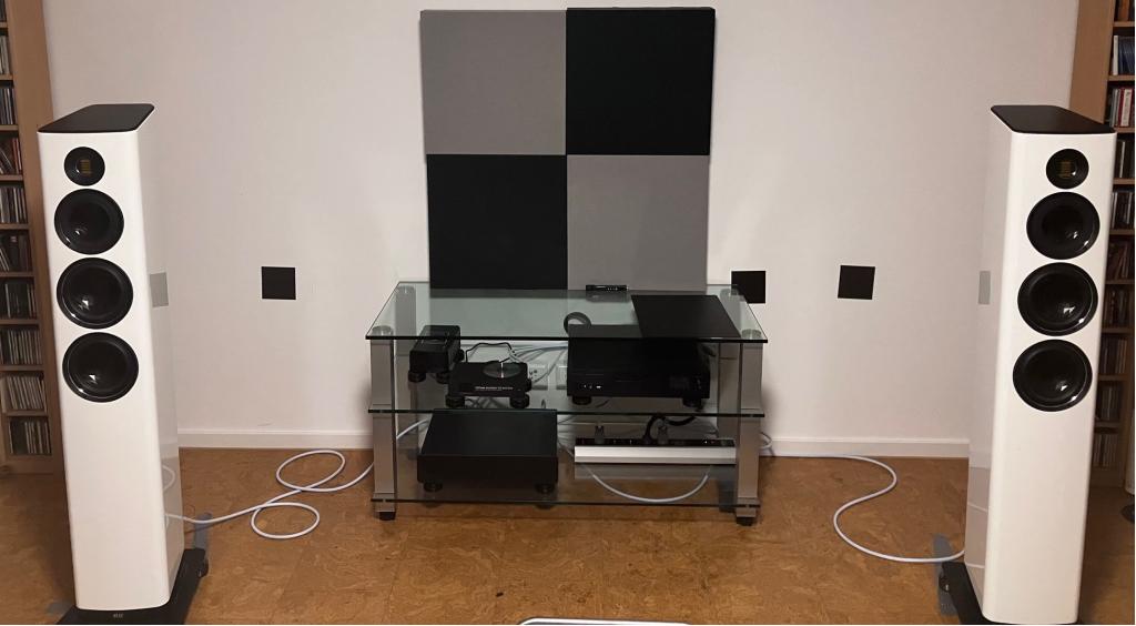 Derzeit stehen sie auf IsoAcoustics Gaia Lautsprecherfüßen, die nicht zum Angebot gehören.