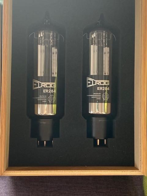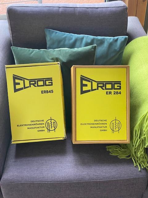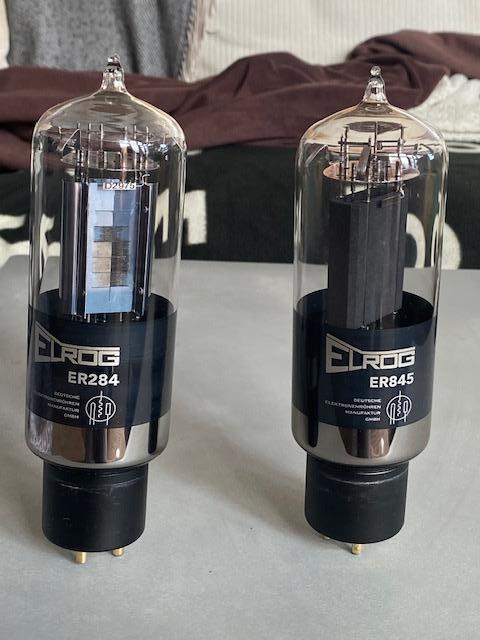 1 Paar, 2 Stück, ELROG 284 Endröhren, kompatibel mit 845 Endröhren, technisch und optisch einwandfrei, am dunklen Röhrensockel feine Kratzer durch das Einbauen der Röhren, Preis 2.250 € / Paar (Neupreis 3.000 €).