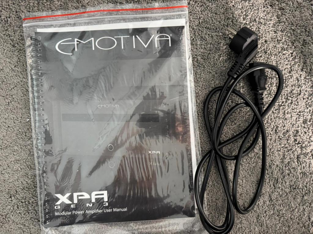 Im Lieferumfang enthalten ist: Emotiva XPA-2 Gen 3, Netzkabel, Anleitung und die originale Verpackung.