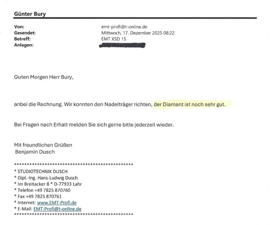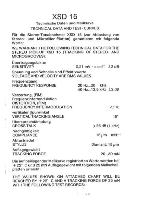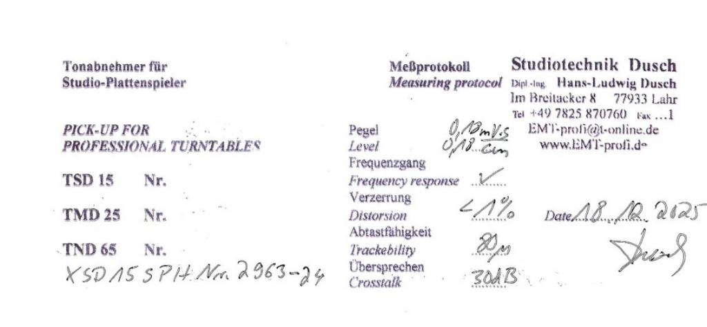 Der EMT XSD 15 SPH stammt aus meiner Sammlung und wurde vom EMT-Profi überprüft. Anschließend gereinigt, optisch aufarbeitet, Nadelträger gerichtet, Dämpfung erneuert, justiert, gemessen sowie protokolliert (Bild 4) und entspricht somit wieder der Werkspezifikation. Es ergeben sich wieder gleiche Eigenschaften wie bei einem neuen System bzgl. bspw. Abtastfähigkeit, Frequenzganglinearität, Pegel/Übersprechen, Verzerrungen.