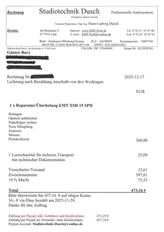 Die Reparatur/Überholung wurde im Dez. 2025 durchgeführt (s. Rechnung, Bild 6).