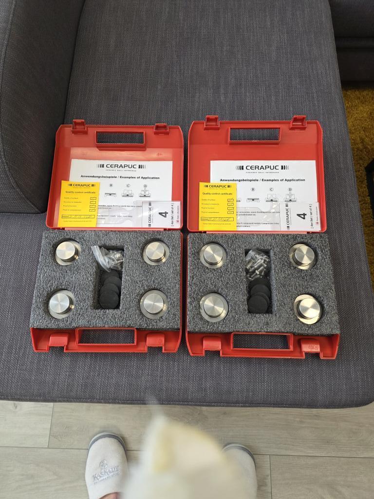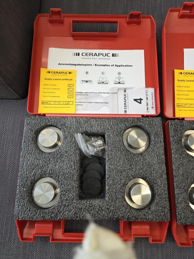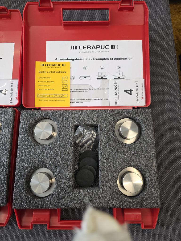 They come In original case with all accessories and in excellent condition, a set of four FE Cerapucs, which have a maximum load bearing of 300Kg.rn rnThey can be used free-standing under individual pieces of equipment, under loudspeakers or in conjunction with Finite Elemente’ range of Pagode racks.rn rnIf space is limited, the bottom (wide) part of the Cerapuc can be used as a support, with or without the anti-slip inserts (see photos).rn rnAlternatively, used with the threaded top section uppermost, a threaded rod can be used to screw into the casework (I use four this way underneath a Nordost Thor mains distribution unit) or as replacement for screw-in speaker footers.rn rnHeight-adjustable and in...