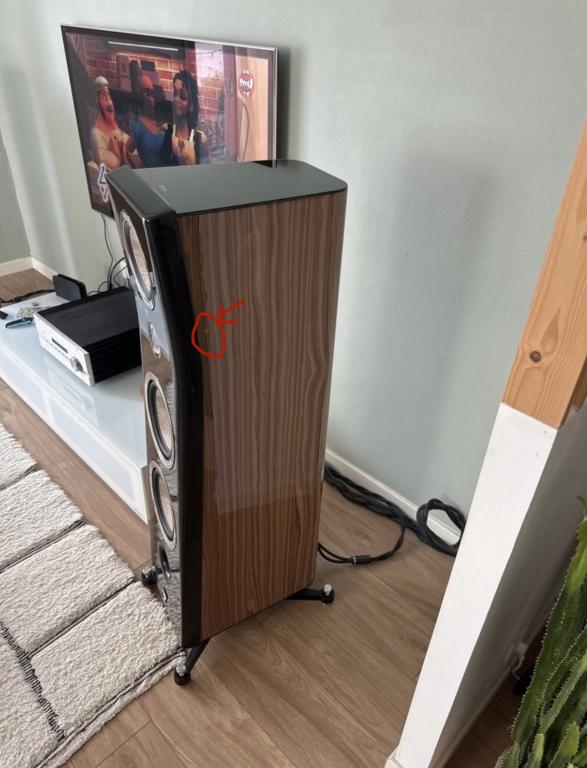 Ein Lautsprecher weist eine kleine, kaum sichtbare Delle auf (siehe Fotos 10 und 11; Nahaufnahmen verdeutlichen den Mangel). Ansonsten ist das System in sehr gutem Zustand.