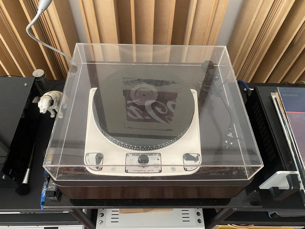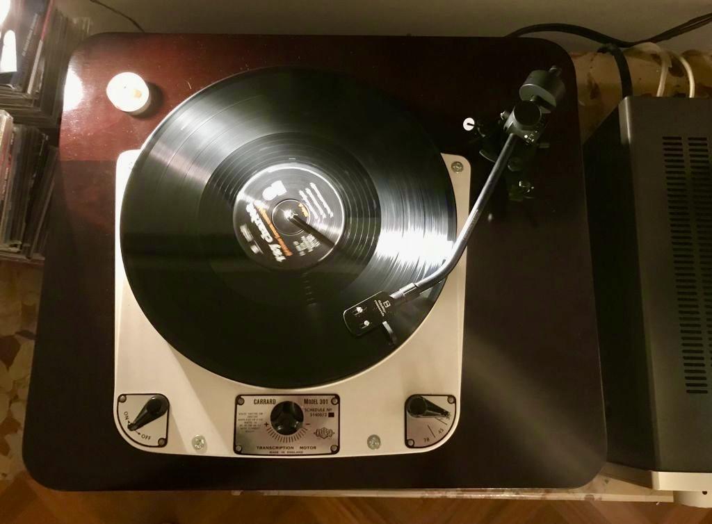Garrard 301 oil bearing turntable, mounted on a wooden base and complete with original 45 rpm adapter, metal record clamp and plexiglass dust cover.