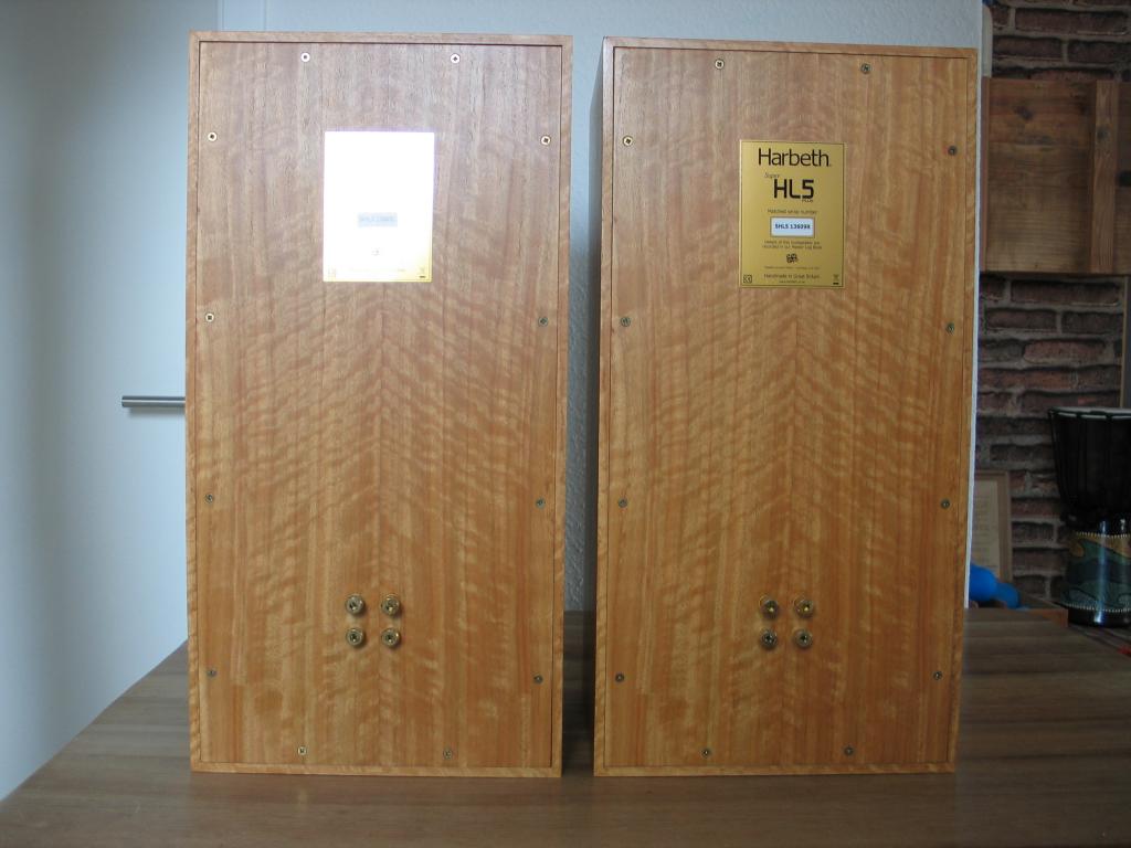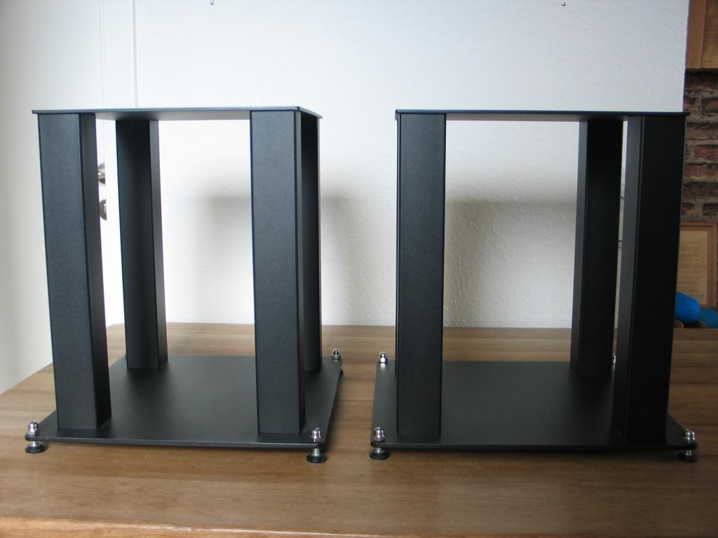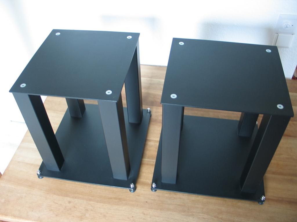 Zwar werden die Super HL5 als Kompaktlautsprecher bezeichnet, aber nur ein Banause würde sie ins Regal stellen. Sie gehören einfach auf die SQ 404 Stands, die meine Harbeth auf Ohrhöhe bringen. Wie auf den Fotos zu sehen ist, sind auch die in makellosem Zustand. Eine OVP gibt es dazu nicht. Dafür sind alle Stützenprofile zu 2/3 mit Granulat gefüllt, was Eigenresonanzen in den Rohren verhindert.