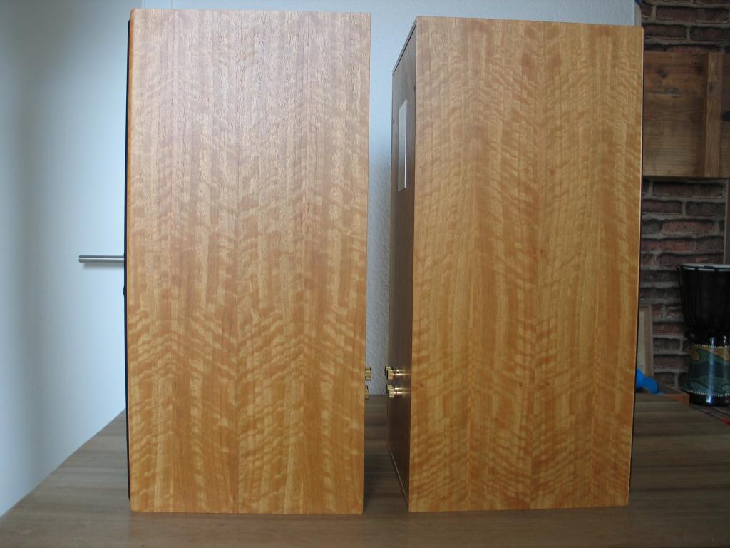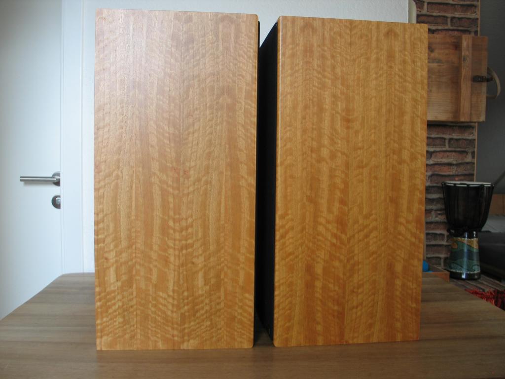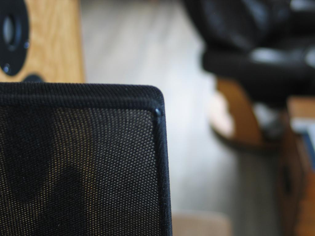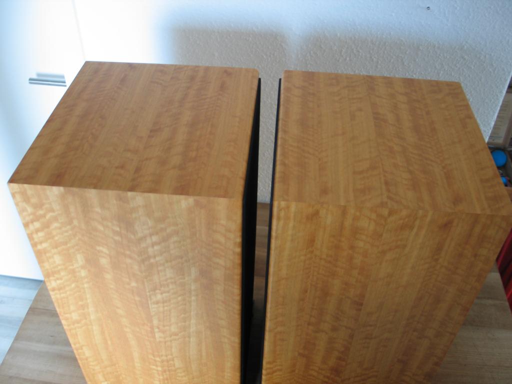 Die Lautsprecher sind gut 5 Jahre alt. Ich habe sie von einem Liebhaber mehr oder weniger im Neuzustand übernommen. Sie waren (und sind) gut und rücksichtsvoll eingespielt. Da es in meinem Haushalt weder Hund, Katze noch Aschenbecher gibt, konnten sie ihre blendende Form erhalten. Nur in der Bespannung einer Box gibt es oben rechts in der Ecke einen minimalen Schaden – siehe Foto). Dafür gibt es als Entschädigung gratis 2 x 4 Absorptionspads und einen superstarken Magneten, mit dem man die Bespannung aus der Front abziehen kann.