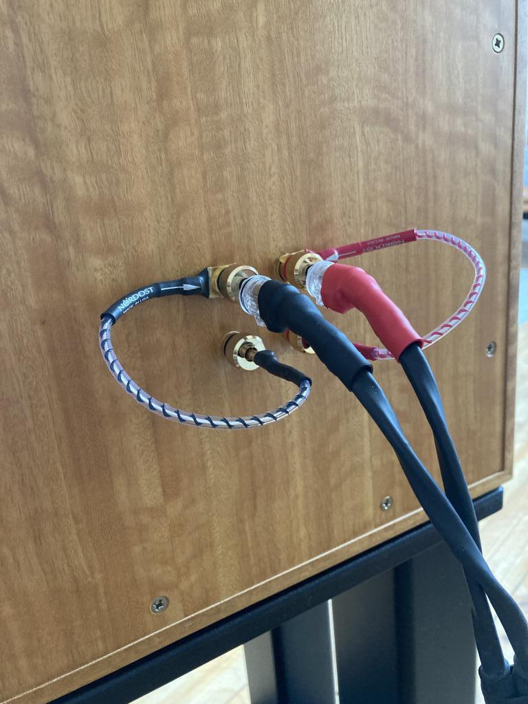 Die Lautsprecher und die Stands sind in sehr guten Zustand, wie NEU. Das Eukalyptus Furnier ist eine Augenweide und zusammen mit den Skylan Stands spielt diese Kombi atemberaubend natürlich. Mit im Lieferumfang sind die original Brücken, die abgebildeten Jumper, die Q-Bricks und die Spikes. Die OVP ist auch vorhanden.