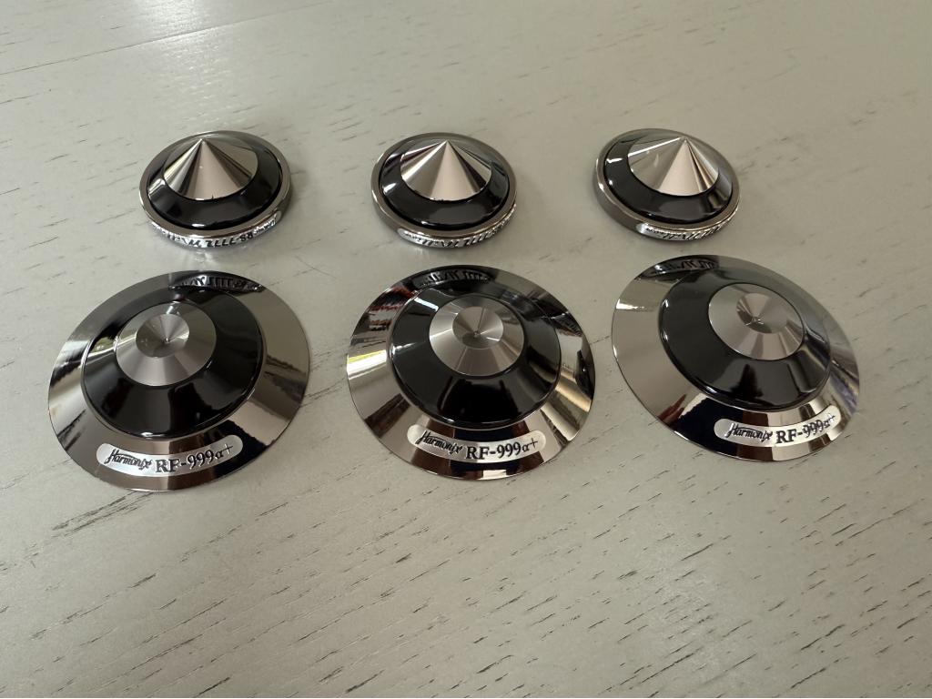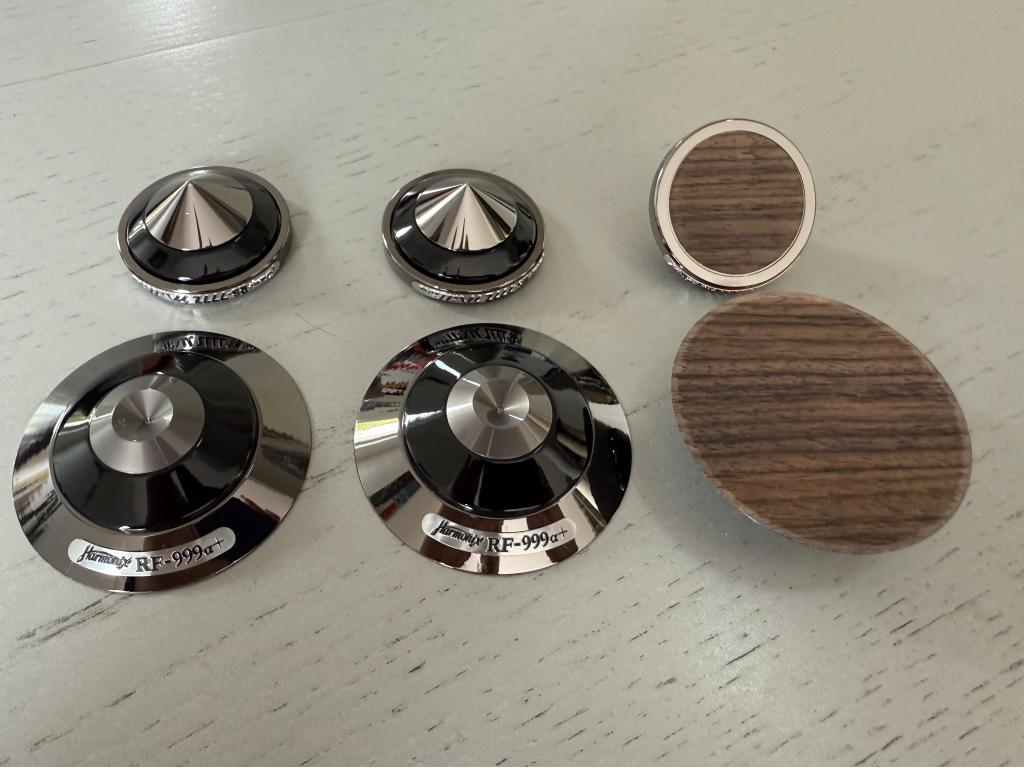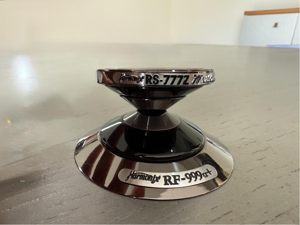 Very high-end audio decoupling set HARMONIX (Japan) 3 Cones RS-777M Hibiki: 22mm(H) x 49.5mm(Φ). New price = 1610 euros 3 Bases RF-999 a+: 73mm(Φ) x Bottom18(H). New price = 1460 euros Total = 3070 euros Noble metal construction, fine wood interfaces for amortisation. Its very transparent and dynamic, brings a balance of naturalness and definition compared to standard or even quality feet. This set is suitable for transport and CD/SACD players, preamps, streamers, power supplies and mains strips, amplifiers.