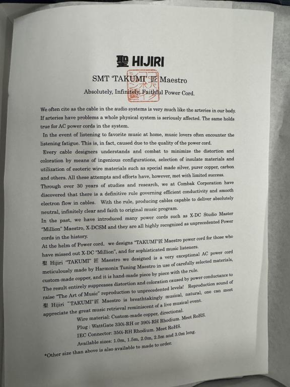 Almost new, barely used reference power cable from Japanese manufacture Combak Harmonix.