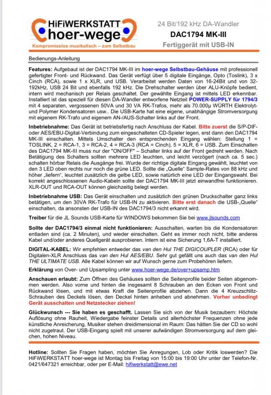 Hifiwerkstatt-Hörwege Hoerwege DAC 1794 MKIII mit USB-IN (verkauft/Sold)