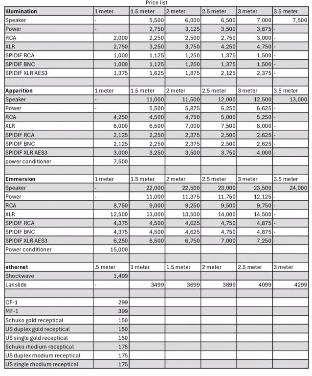AC Power Conditioner: Apparition - 7500€ US and EU Socket, Emmersion - 15000€ US Socket only.
