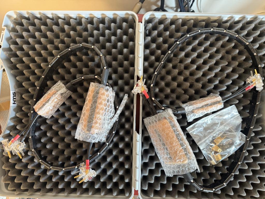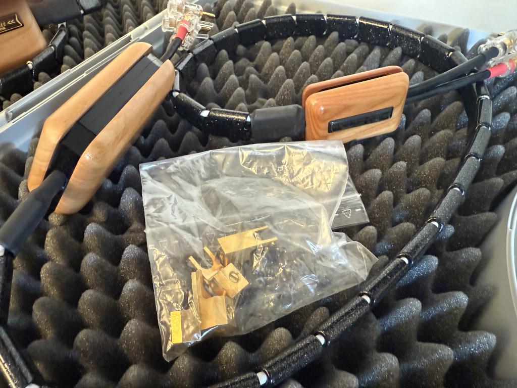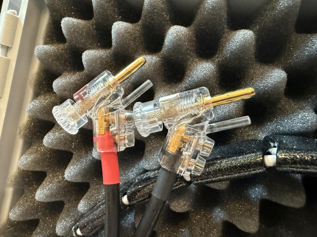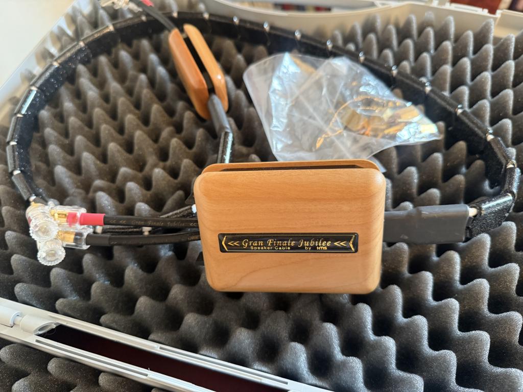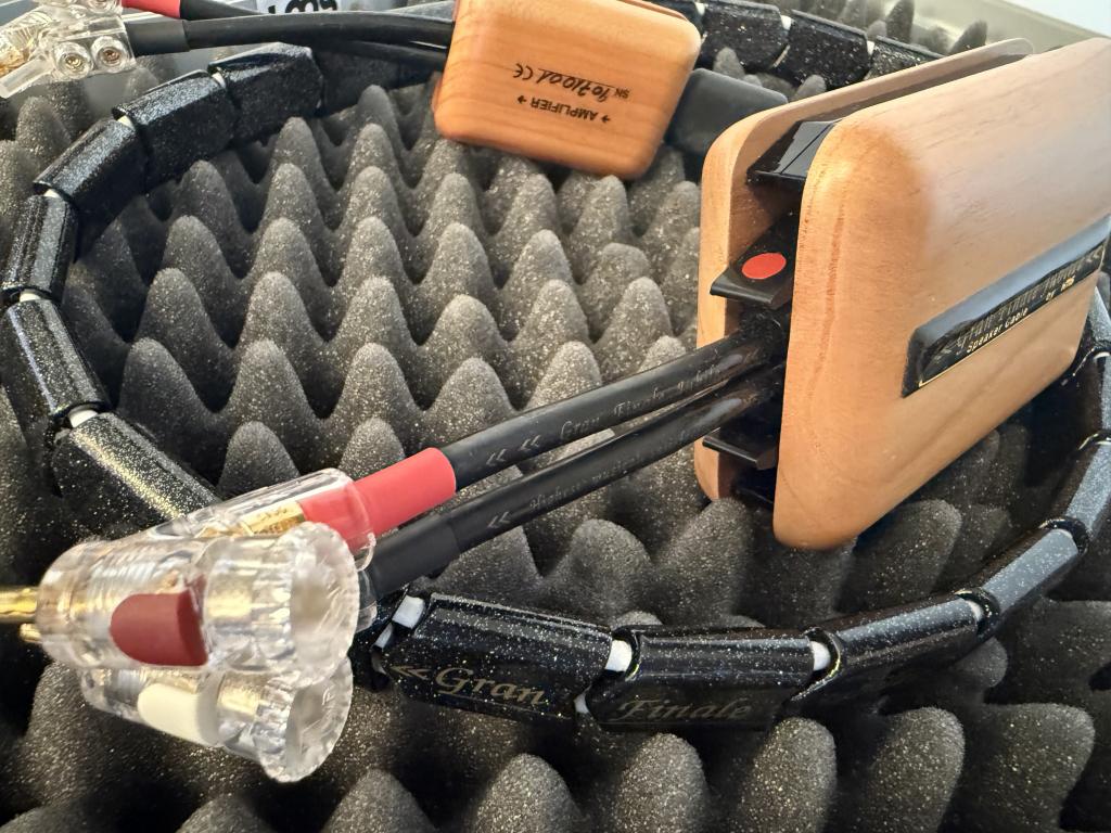 HMS: Das Lautsprecherkabel HMS Gran Finale Jubilee zeichnet sich durch seine extrem solide Konstruktion aus, insbesondere durch pfeilförmige Ferritkerne, die Magnetfeldverluste minimieren. Diese Ferrite mit hoher magnetischer Leitfähigkeit konzentrieren Magnetfelder, was zu einer deutlichen Verringerung der Induktivität auf 40 nH/Meter im Vergleich zum Standard-Gran Finale führt. Der Widerstand wird ebenfalls auf 6,86 mOhm/Meter reduziert. Weitere einzigartige Merkmale sind 1584 einzelne Litzen in teflonisolierten Bündeln und Holz-Acryl-Gehäusen, die ein Zobel-Netzwerk und eine umschaltbare(!) Impedanzanpassung für eine optimale Leistung von auch Röhrenverstärkers enthalten.