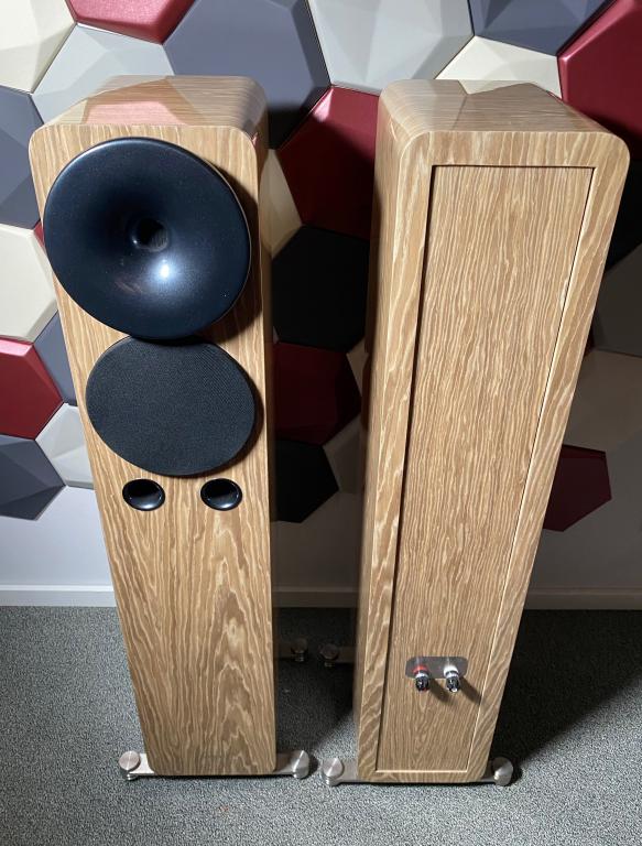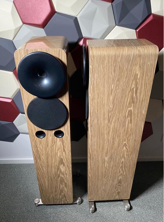 Die Ausführung in Sibirian Oak Glossy in Hochglanzoptik mit dem Horn in Graugrün lässt diesen Lautsprecher sehr edel erscheinen.
