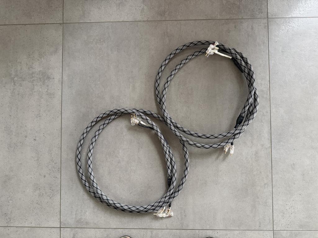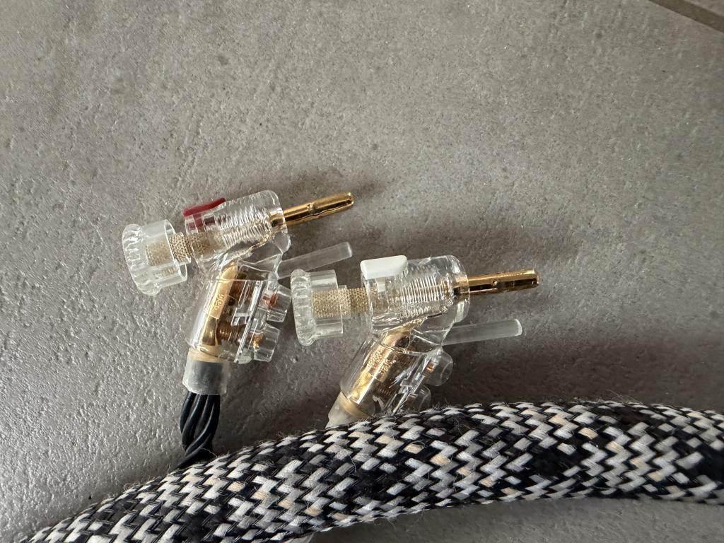 Die Lautsprecherkabel sind mit an den Enden mit WBT-Goldhülsen gekrimpt und mit WBT-Winkelbananas verschraubt. Die Banana könnten somit auch mit anderen WBT-Steckern einfach getauscht werden.