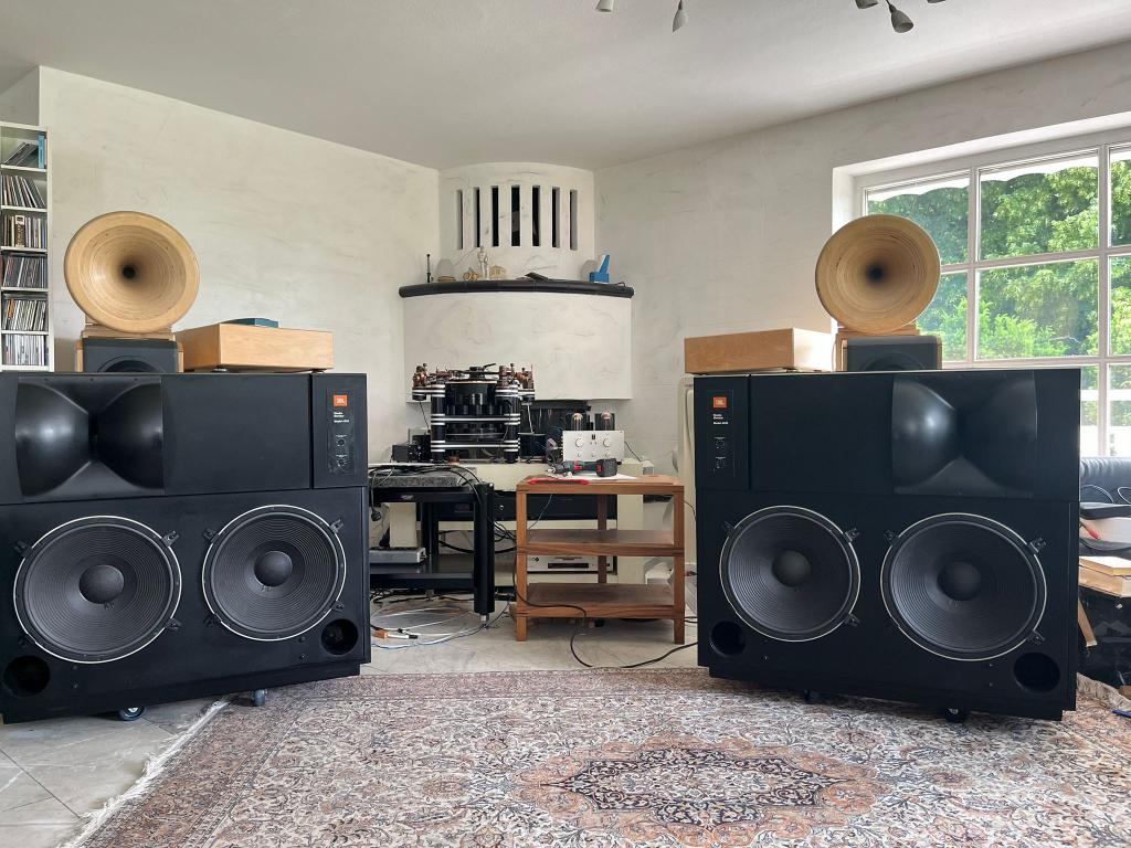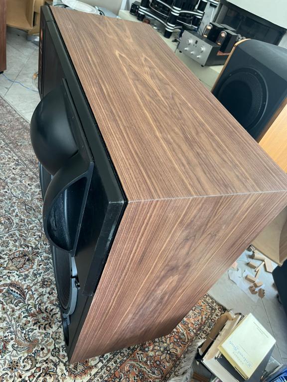 Die großen Studiomonitore, mit doppelt dickem Furnier neu vom Tischlermeister versehen (Kosten: 2500€). Front dreifach neu lackiert. Treiber sehr gut erhalten.