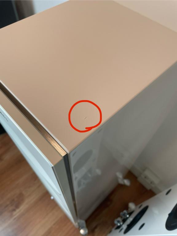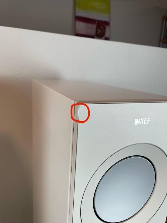 Minimale Macke in der Front die man nur im richtigen Winkel sehen kann und eine Macke oben auf dem anderen Lautsprecher.