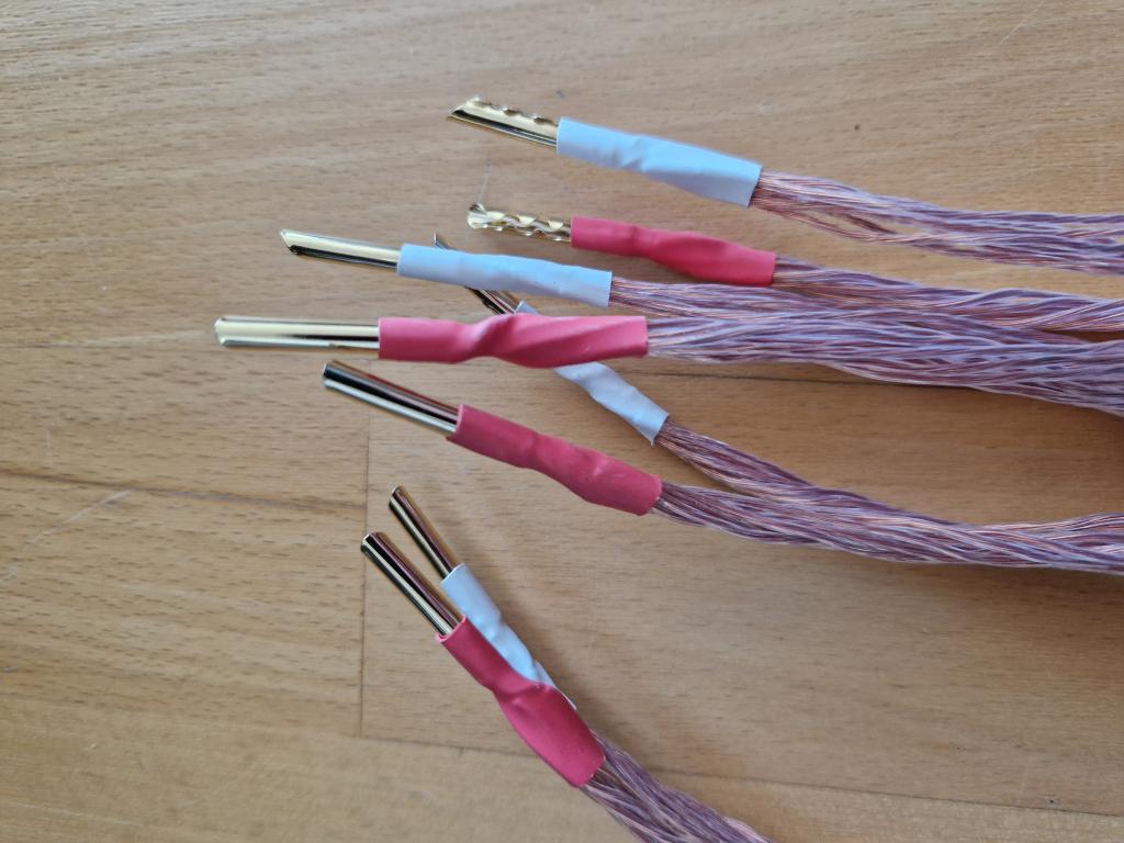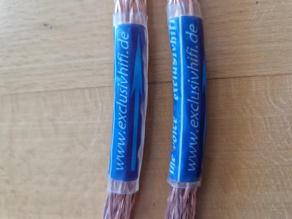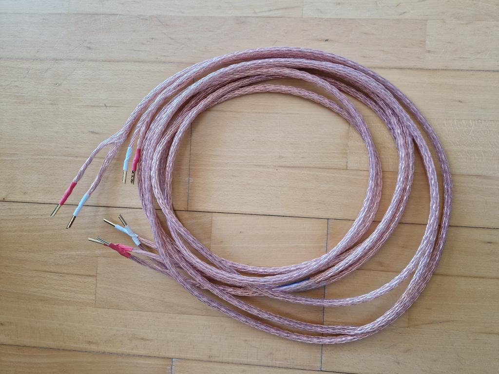 Ursprünglich als Mono-Kabel 8m hergestellt, inzwischen zu 2x 4m umkonfektioniert. Mit Hohl-Bananas.