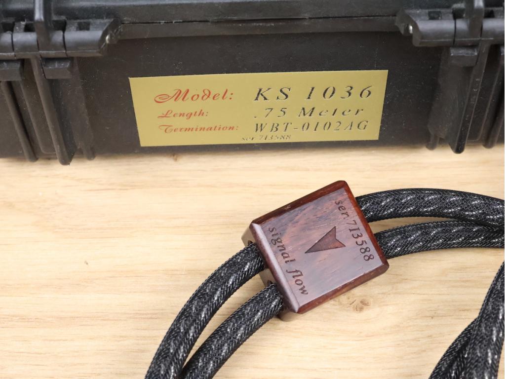 One pair of Kimber Kable Select KS-1036 high end silver audio interconnect cables in a fantastic condition. Six 25AWG Black Pearl solid silver conductors drawn in diamond coated dies and insulated with virgin FEP dielectric under the most exacting tolerances which offer the purest transfers of the most demanding highest resolution signals. These interconnects produce silent backdrops for vivid tonal color and flawless creation of space, time and ultimately the soul of the performance. KS-1036 is based on the KS-1030 technically. Densely apportioned orthogonal geometry increases the mass of the Black Pearl silver conductors and ESD yarn within the constrained matrix. The result is a full bodied sound, dynamic with a lot of articulation while remaining delicately detailed and sweet.