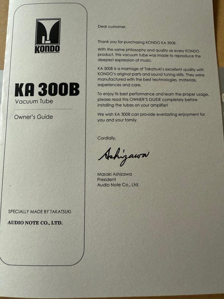 Kondo 300B valves made by Takatsuki according to Kondos requirements. Kondo legendary "original parts" and sound tuning are used. Limited availability. (20-30 pairs/year in total)