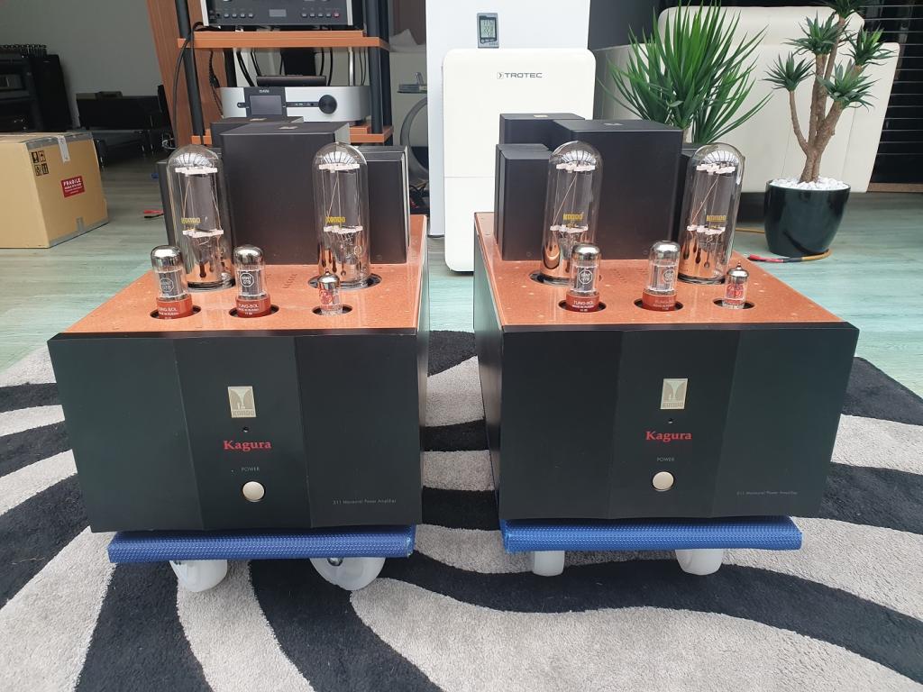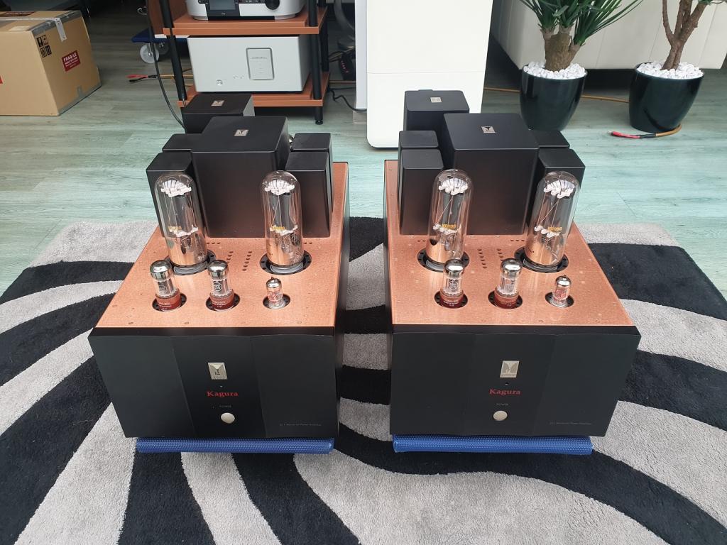 Kondo AudioNote Mono-Blöcke Typ Kagura i - mit außergewöhnlichem Aufwand gelingt Kondo ein Kunststück: ein Single-Ended-Verstärker mit 50 Watt Leistung! Das Netzteil besteht je Monobock aus 3 Trafos mit 2 Stromkabeln. Silberverdrahtung, Silber-Kondensatoren, Silberwicklungen in den Ausgangsübertragern - hier wird nichts dem Zufall überlassen, hier wird kein Kompromiss geduldet.