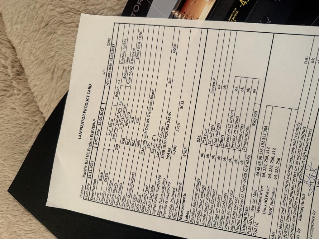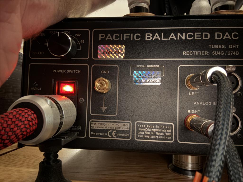 The DAC is quite specific, as it was upgraded additionally by Lampizator team. It has removed redundant components of the power filter at the back. It has also special dumpers installed on the upper plate - so the upper plate with tube socket is higher and closer to the lid - much more convenient for tube rolling or installation of any tube adapters.