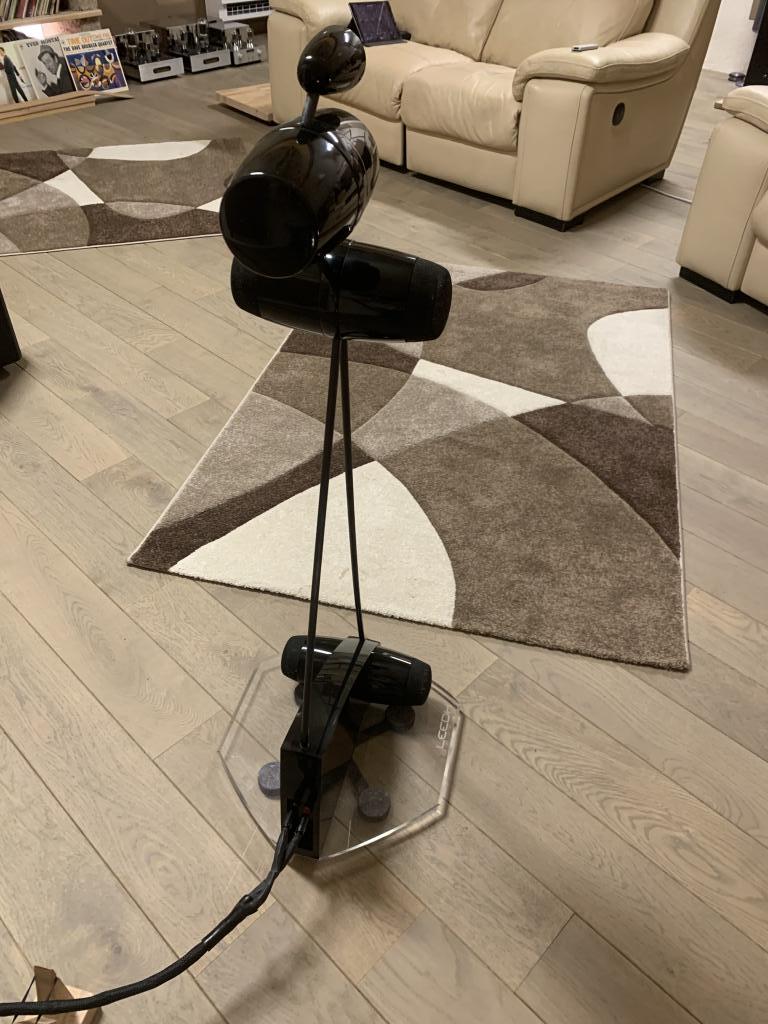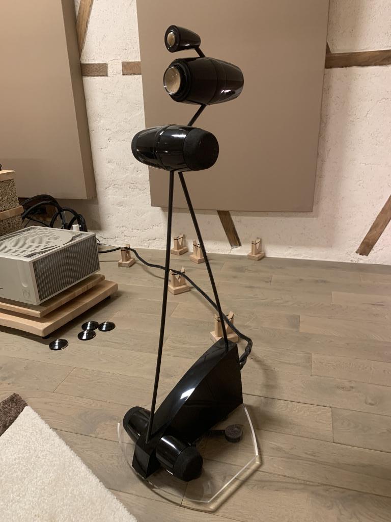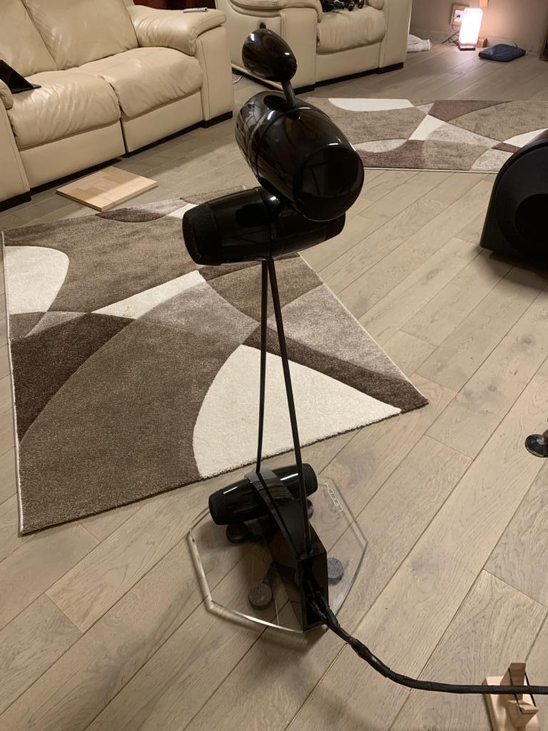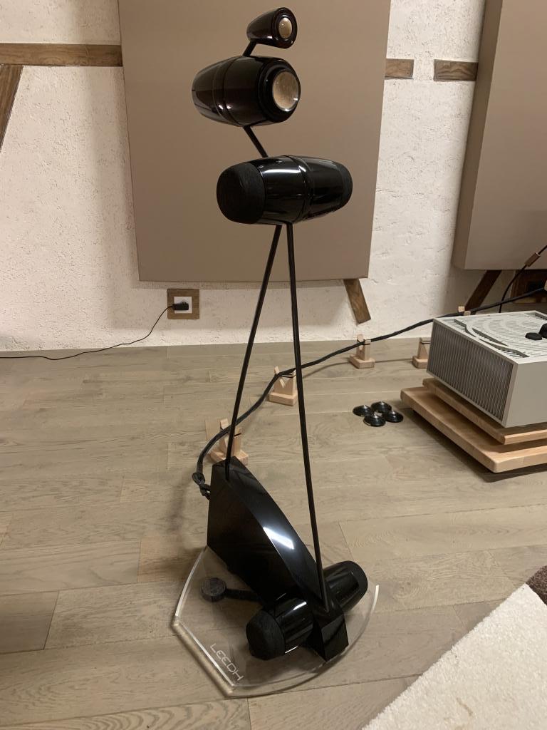 The E2 Glass are unique with a design based on speakers without conventional suspension but ensured by a ferrofluid seal held by the powerful neodymium magnets of each transducer. The membranes are made of glass, an amorphous material without characteristic sound. Each transducer is complemented by its opposite counterpart in a position to cancel the rear waves in a small load, and the non-directive frequencies are emitted laterally so as not to disturb the quality of the sound image by the waves returned by the ground. The same goes for the subwoofer equipped with two 38 cm and two 21 cm specific loads with two integrated 500 watt amps. The result is listening without any box sound, a total disappearance of the speakers, a total absence of projection, low efficiency but great speed . I would say of them that they offer a French neutrality in the global audiophile landscape, little coloring, a listening combining a contemplative, stripped down and inhabited aspect, to be associated with electronics giving good density and richness.