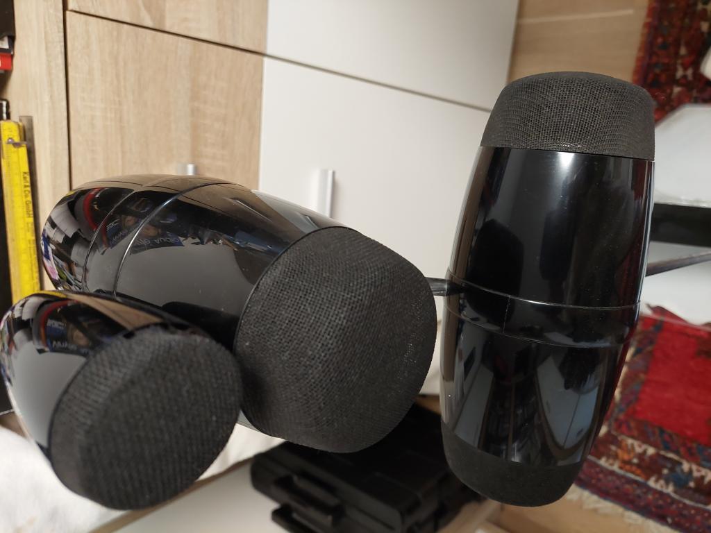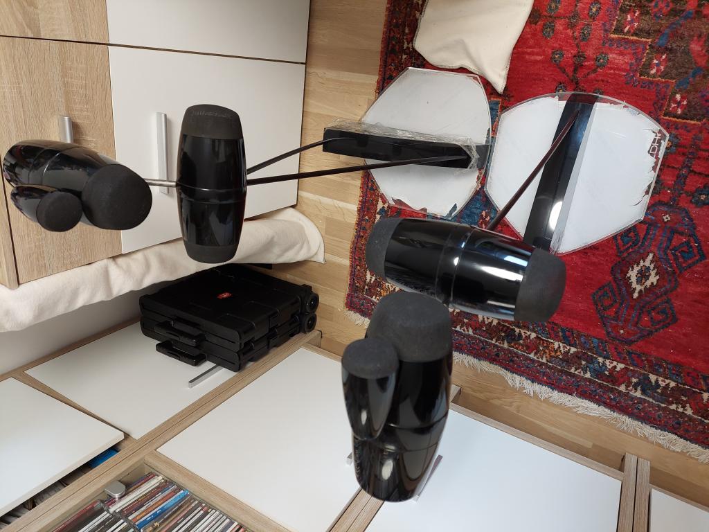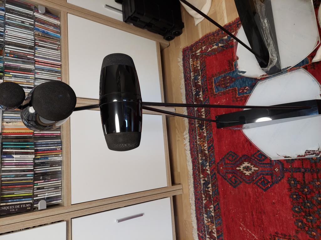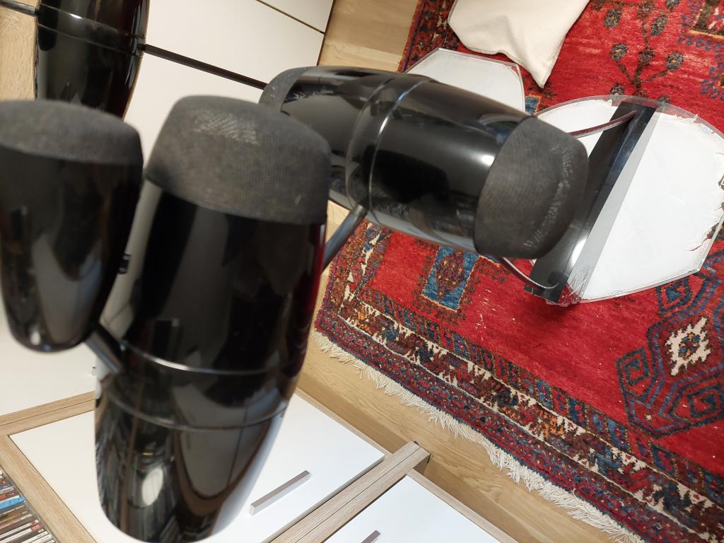 Der Mitteltöner, ebenfalls auf die Hörachse ausgerichtet, wird ebenfalls von einer passiv-Membran begleitet, dessen einzige Funktion darin besteht, die mechanische Reaktion zu unterbinden. Diese drastische Jagd auf die störenden mechanischen Vibrationen, welche die konventionellen Lautsprecher aufweisen, wurde auf alle Mini-Gehäuse jedes Lautsprechers übertragen. Hergestellt aus einem sehr belastbaren, mineralischem Verbundwerkstoff, dessen nicht existierende Eigenresonanzen, zu einer höheren Bandbreite führen. Zudem trägt sein absorbierendes Material dazu bei, das ohnehin schon geringe Luftvolumen in den kleinen Gehäusen, das nur bei hohen Frequenzen schwingt, leichter zu bedämpfen.