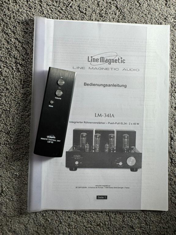 Im Lieferumfang enthalten ist: Line Magnetic LM-34iA, Netzkabel, Fernbedienung, Anleitung und die originale Verpackung.