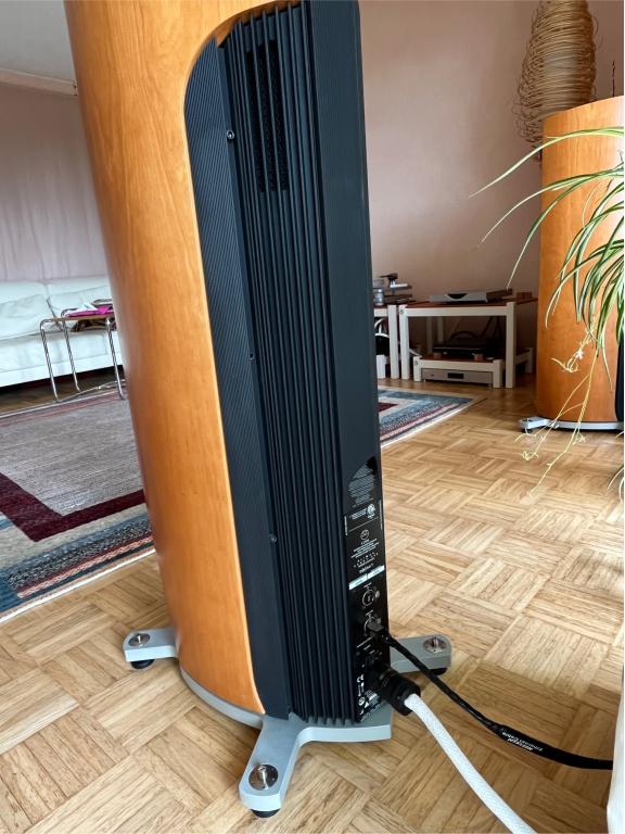 Der Lautsprecher ist fast neuwertig, bis auf Gebrauchtspuren am Ständer, die durch die Nutzung der Spike Zange einfach entstehen (die Spike Zange ist natürlich mit dabei wie auch die Transportabdeckungen für das 3 K Array und die Kunststoffumfassungen für den Lautsprechertransport ).