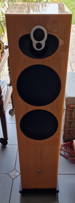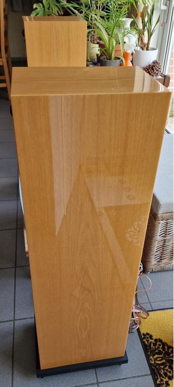 Exakt fähige Standlautsprecher in Eiche High Gloss für Aktiv Betrieb konfiguriert.