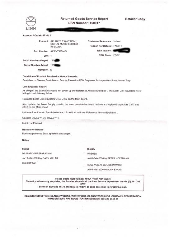 Im März 2026 direkt wegen Verzögerung der EXakt Verbindung bei Linn im Werksservice vollständig überprüft und instand gesetzt (Exakt Link Sektion).