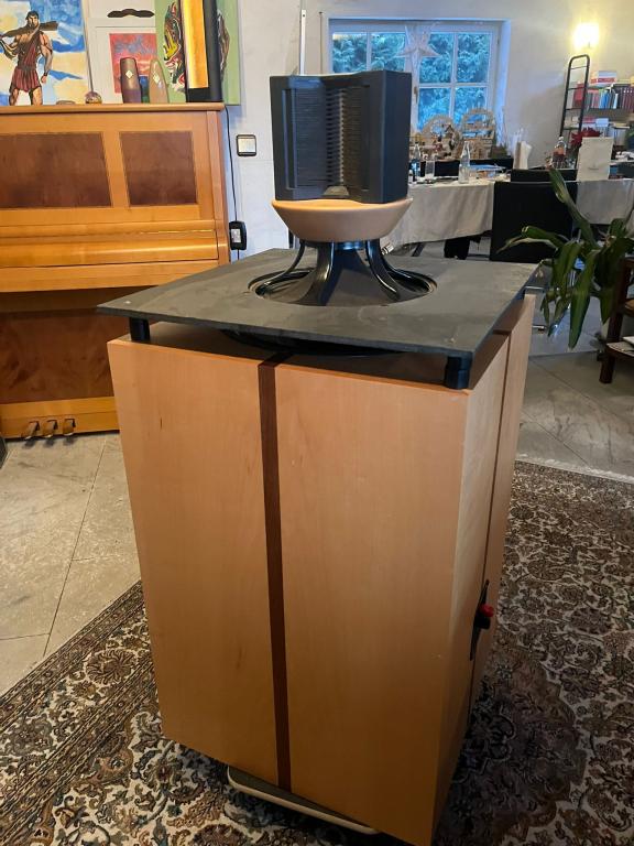 Jürgen Pack Lautsprecher mit 38er Profi Bass, Supravox Mitteltöner, die auf Holzkegel strahlen. Als Hochtöner ASS EMT. Hoher Wirkungsgrad omnidirektionale Abstrahlung. Sehr angenehm und natürlich. Sehr flexibel in Aufstellung und Hörplatz.