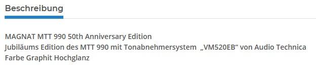 Ich verkaufe meinen Magnat MTT 990 50th Anniversary Plattenspieler. Der Magnat ist ein Jahr und fünf Monate jung und optisch und funktional in einem Neuzustand. UVP ist aktuell 1499 Euro. Als Singlehaushalt wurde er nur von mir und das immer mit höchster Sorgfalt bedient. Da ich einen anderen Tonabnehmer benutze, ist der Originaltonabnehmer, ein Audio Technica VM520EB MM, absolut unbenutzt und demnach neu. Er hat einen Direktantrieb, bietet feinfühlige VTA Einstellung von 6mm sowie zum einfachen tauschen der Headshells einen SME Anschluss am Tonarm. Gewicht 11kg. Mehr Infos im Web. Verschickt wird er in der Originalverpackung mit der Bedienungsanleitung, einem Netzkabel und einem Cinch/RCA Kabel. Der Versand in die EU ist gratis. Verkauf wegen Upgrade auf einen anderes Plattenspielermodell.