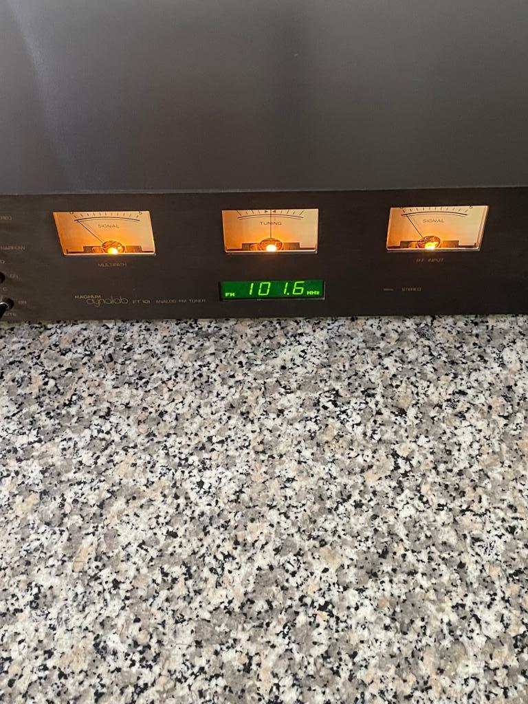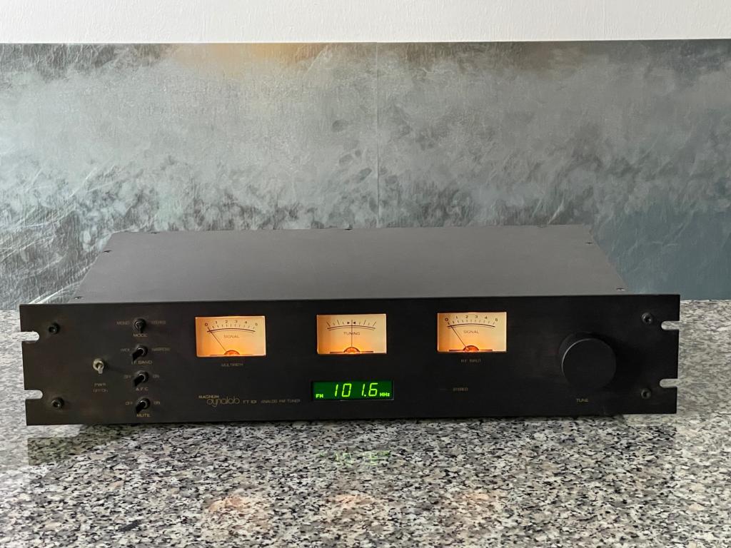 Der in Kanada hergestellte Magnum Dynalab FT 101, der das FM-Band (88 bis 108 MHz) abdeckt, ist vielleicht der letzte der analogen Tuner - und der einzige hochwertige, der in den nächsten Jahren , seinen Nachbesitzer zuverlässig erfreut.Sein Abstimmregler ( Vollmetall), eine seltenes Ausstattungsmerkmal, der heutigen digitalen Tuner, variiert die Einstellung eines Potentiometers, dessen Ausgangsspannung die Frequenz eines spannungsgesteuerten Oszillators steuert. Das schwere Schwungrad bietet eine schöne seidige und genaue Regelung,die früher ein Markenzeichen eines guten Tuning-Mechanismus war.