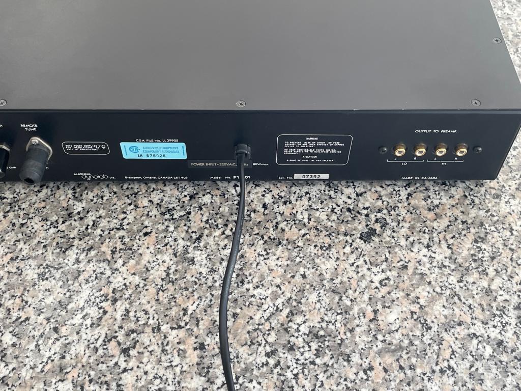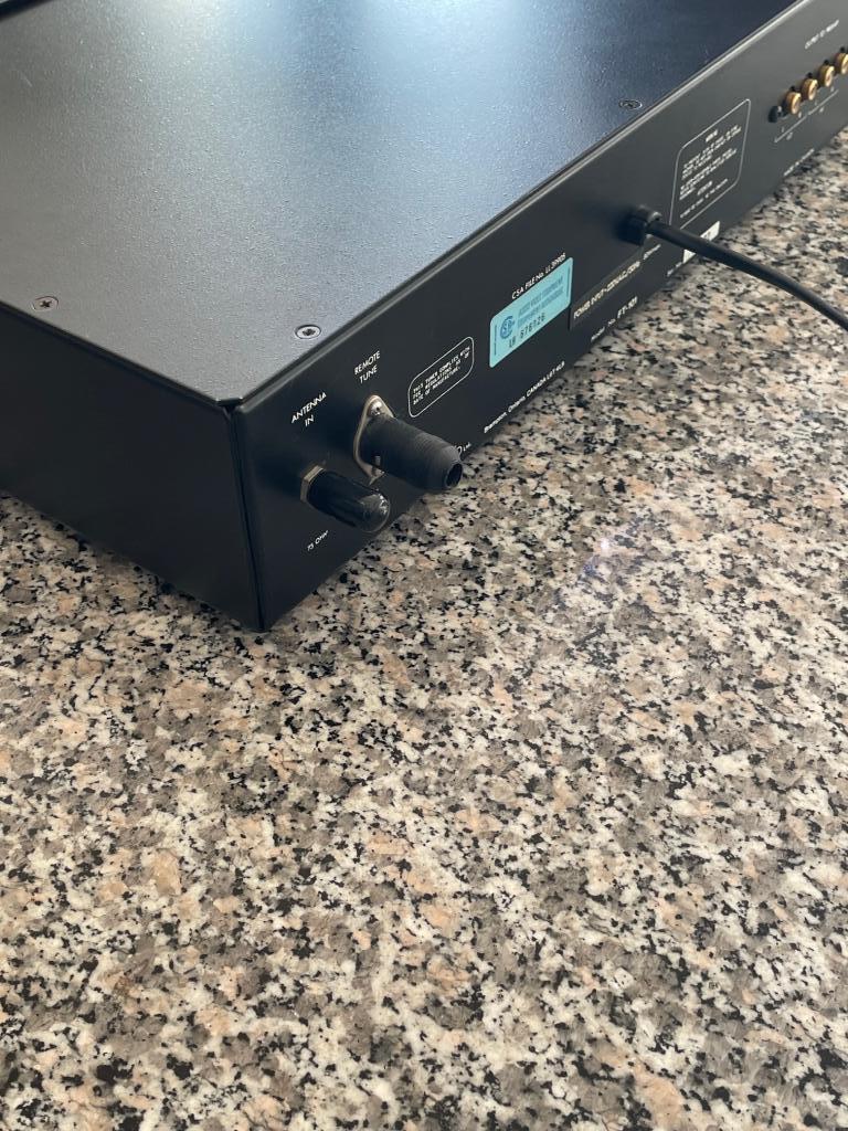 Die hintere Schürze des Tuners enthält einen F-Koaxialstecker für eine 75-Ohm-FM-Antenne und zwei Paar vergoldete Audioausgangsbuchsen. Diese mit HI und LO gekennzeichneten Buchsen tragen das Audiosignal auf zwei verschiedenen festen Ebenen für die Kompatibilität mit Vorverstärkern (wie einigen britischen Modellen), deren Line-Level-Eingänge für den Betrieb mit Low-Level-Eingangssignalen ausgelegt sind.