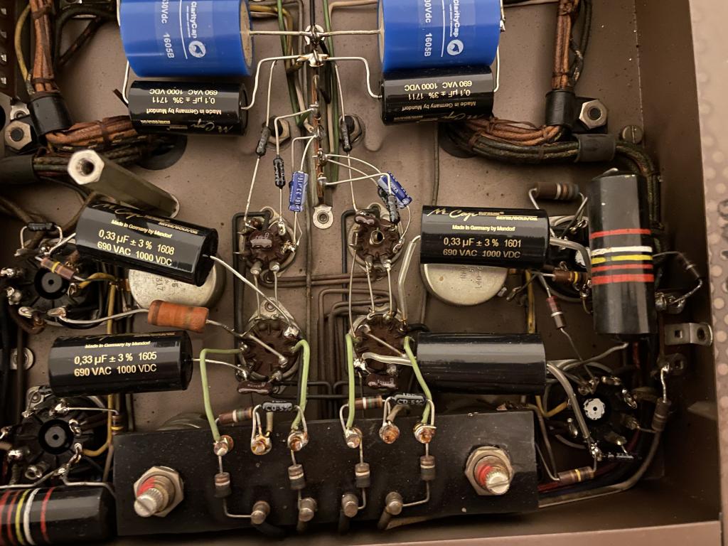 Aufwertung mit hochwertigen Mundorf supreme silver gold oil Kondensatoren. Außerdem erfolgten Anpassungen im Bereich der Stromversorgung. Insgesamt konnte der Grundcharakter des Originalzustandes beibehalten werden, hinzu kommt eine bessere Auflösung und Klarheit im Klangbild durch den Umbau.