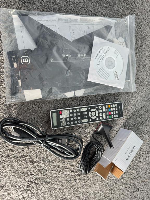 Im Lieferumfang enthalten ist: Marantz AV7702 MK2, Fernbedienung, Netzkabel, Einmessmikrofon, Anleitung und die originale Verpackung.