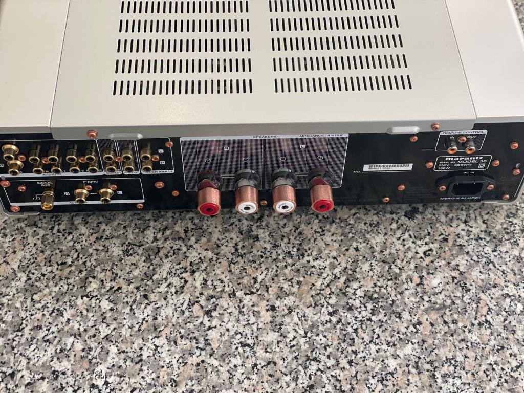 Bestmögliche Qualität auch bei den fest sitzenden Anschlüsse hinten. Die CD- und die Phono-Eingangs-Buchsen sind besonders edel ausgeführt, was zu einer enorm hoch liegenden Kontaktsicherheit führt. Die gesamte Rückseite ist solide verschraubt. Marantz-eigene Lautsprecherkabel-Anschlüsse aus hochreinem Kupfer sind ebenfalls ein spezielles Merkmal.